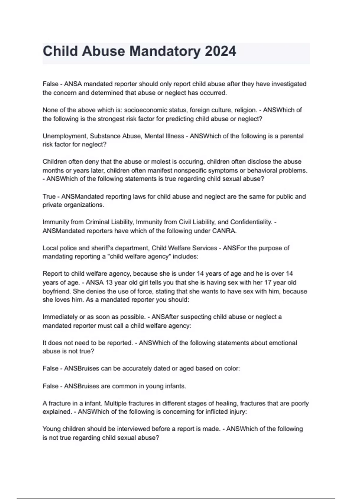 Child Abuse Mandatory NEWEST 2026/2027 ACTUAL EXAM COMPLETE QUESTIONS AND CORRECT DETAILED ANSWERS (VERIFIED ANSWERS) |ALREADY GRADED A+||BRAND NEW!!