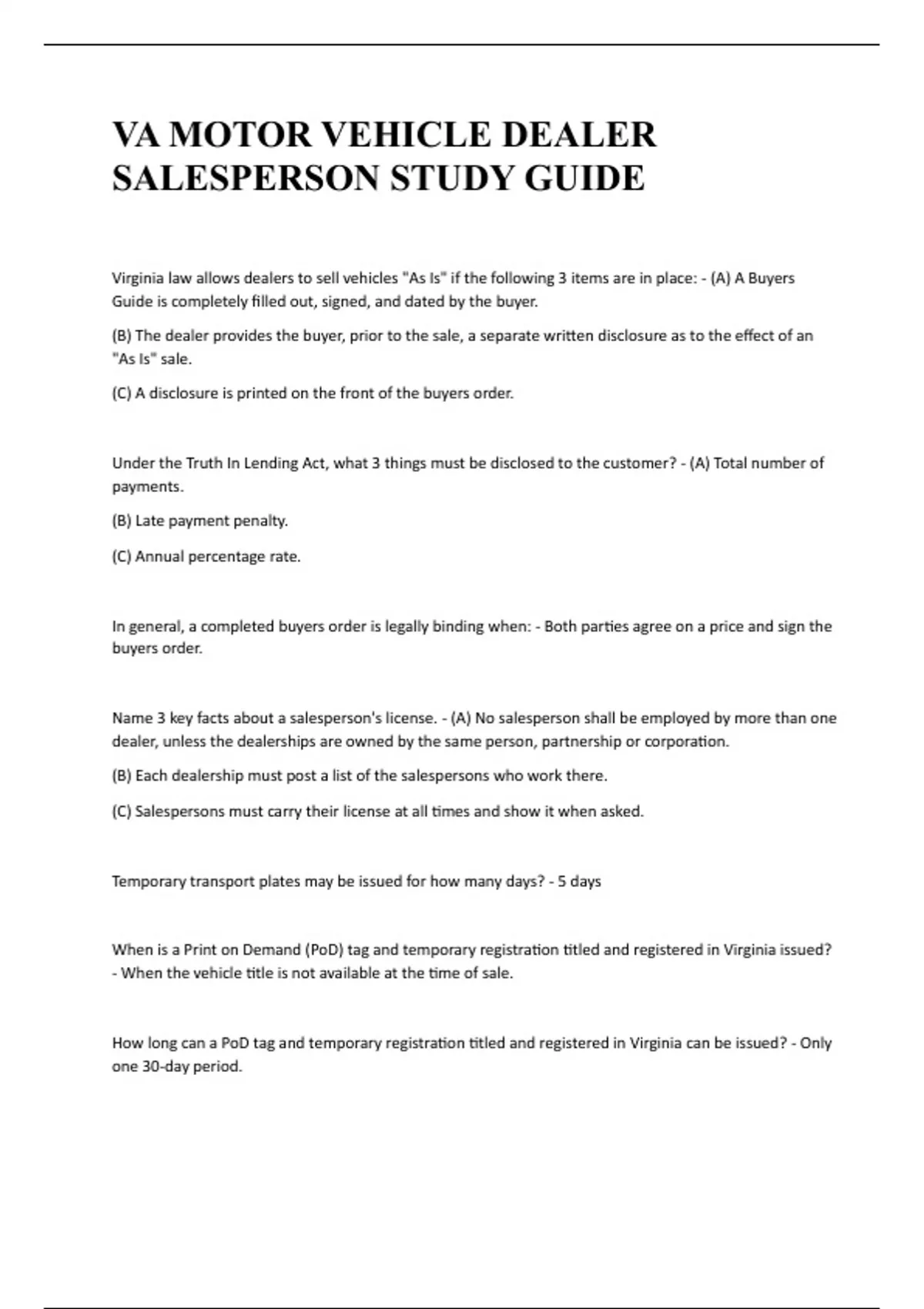 Virginia law allows dealers to sell vehicles "As Is" if the following 3 items are in place: - (A) A Buyers Guide is completely filled out, signed, and dated by the buyer. (B) The dealer provides the buyer, prior to the sale, a separate written disclosure as to the effect of an "As Is" sale. (C) A disclosure is printed on the front of the buyers order. Under the Truth In Lending Act, what 3 things must be disclosed to the customer? - (A) Total number of payments. (B) Late payment penalty. (C) Annual percentage rate. In general, a completed buyers order is legally binding when: - Both parties agree on a price and sign the buyers order. Name 3 key facts about a salesperson's license. - (A) No salesperson shall be employed by more than one dealer, unless the dealerships are owned by the same person, partnership or corporation. (B) Each dealership must post a list of the salespersons who work there. (C) Salespersons must carry their license at all times and show it when asked. Temporary transport plates may be issued for how many days? - 5 days