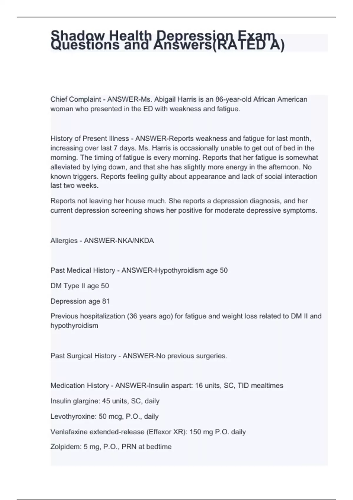 Shadow Health Depression Exam Questions and Answers(RATED A)