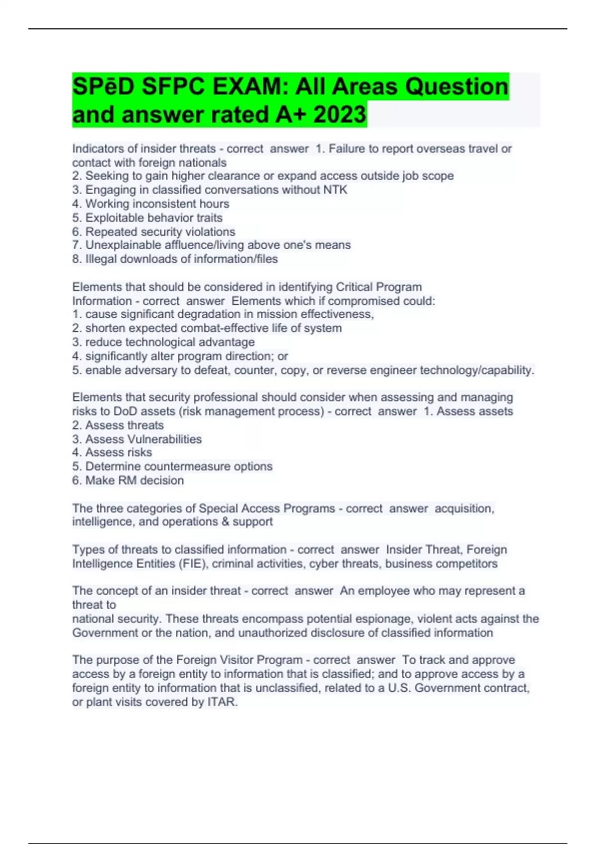 SPēD SFPC EXAM Question and answers rated A+ 2024 SPēD SFPC EXAM: All Areas Question and answer rated A+ 2023 Indicators of insider threats - correct answer 1. Failure to report overseas travel or contact with foreign nationals 2. Seeking to gain higher clearance or expand access outside job scope 3. Engaging in classified conversations without NTK 4. Working inconsistent hours 5. Exploitable behavior traits 6. Repeated security violations 7. Unexplainable affluence/living above one's means 8. Illegal downloads of information/files Elements that should be considered in identifying Critical Program Information - correct answer Elements which if compromised could: 1. cause significant degradation in mission effectiveness, 2. shorten expected combat-effective life of system 3. reduce technological advantage 4. significantly alter program direction; or 5. enable adversary to defeat, counter, copy, or reverse engineer technology/capability. Elements that security professional should consider when assessing and managing risks to DoD assets (risk management process) - correct answer 1. Assess assets 2. Assess threats 3. Assess Vulnerabilities 4. Assess risks 5. Determine countermeasure options 6. Make RM decision The three categories of Special Access Programs - correct answer acquisition, intelligence, and operations & support Types of threats to classified information - correct answer Insider Threat, Foreign Intelligence Entities (FIE), criminal activities, cyber threats, business competitors The concept of an insider threat - correct answer An employee who may represent a threat to national security. The