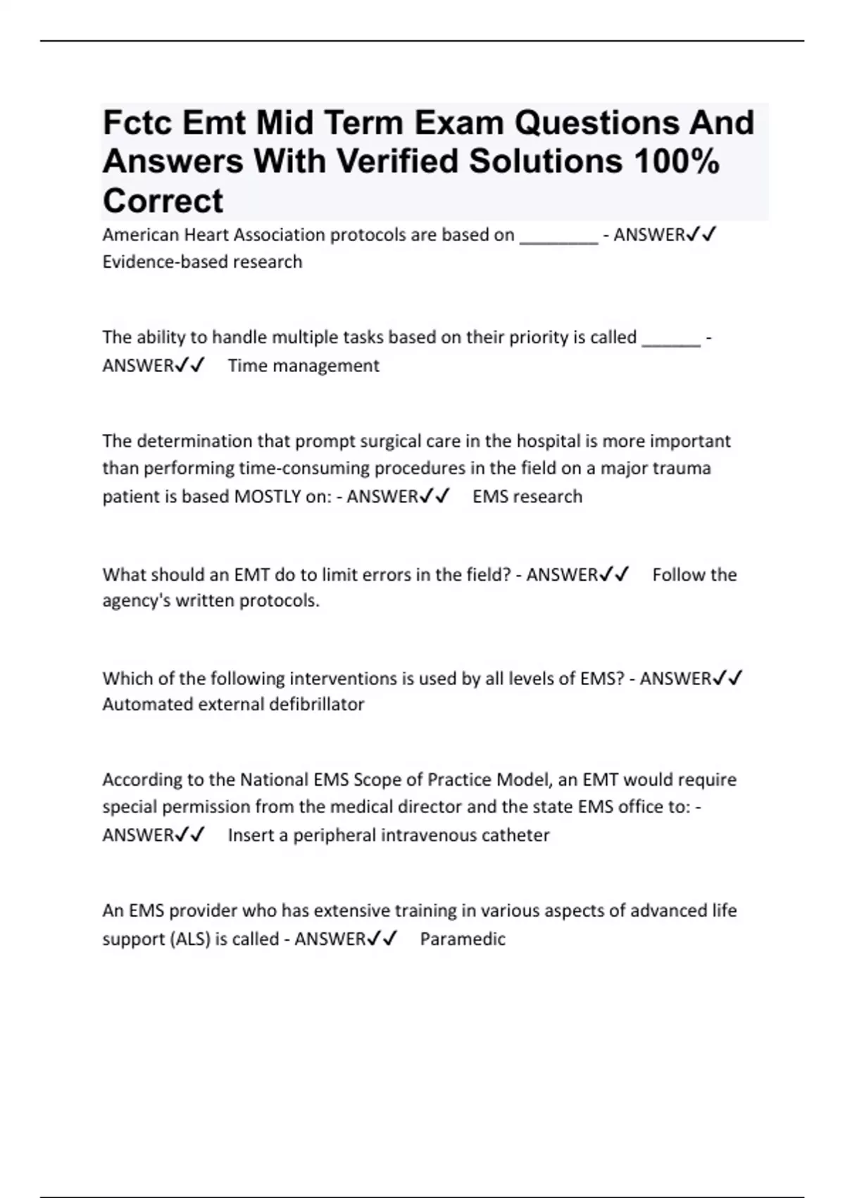 Fctc Emt Mid Term Exam Questions And Answers With Verified Solutions 100 Correct