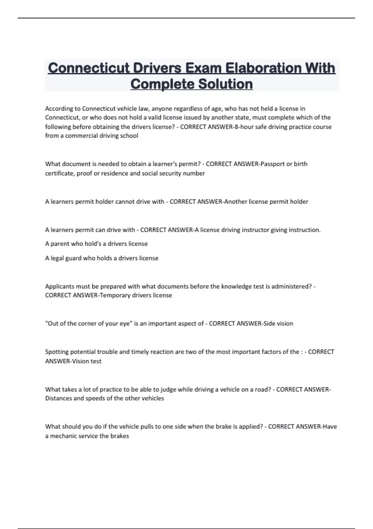 Connecticut Drivers Exam Elaboration With Complete Solution According to Connecticut vehicle law, anyone regardless of age, who has not held a license in Connecticut, or who does not hold a valid license issued by another state, must complete which of the following before obtaining the drivers license? - CORRECT ANSWER-8-hour safe driving practice course from a commercial driving school What document is needed to obtain a learner's permit? - CORRECT ANSWER-Passport or birth certificate, proof or residence and social security number A learners permit holder cannot drive with - CORRECT ANSWER-Another license permit holde