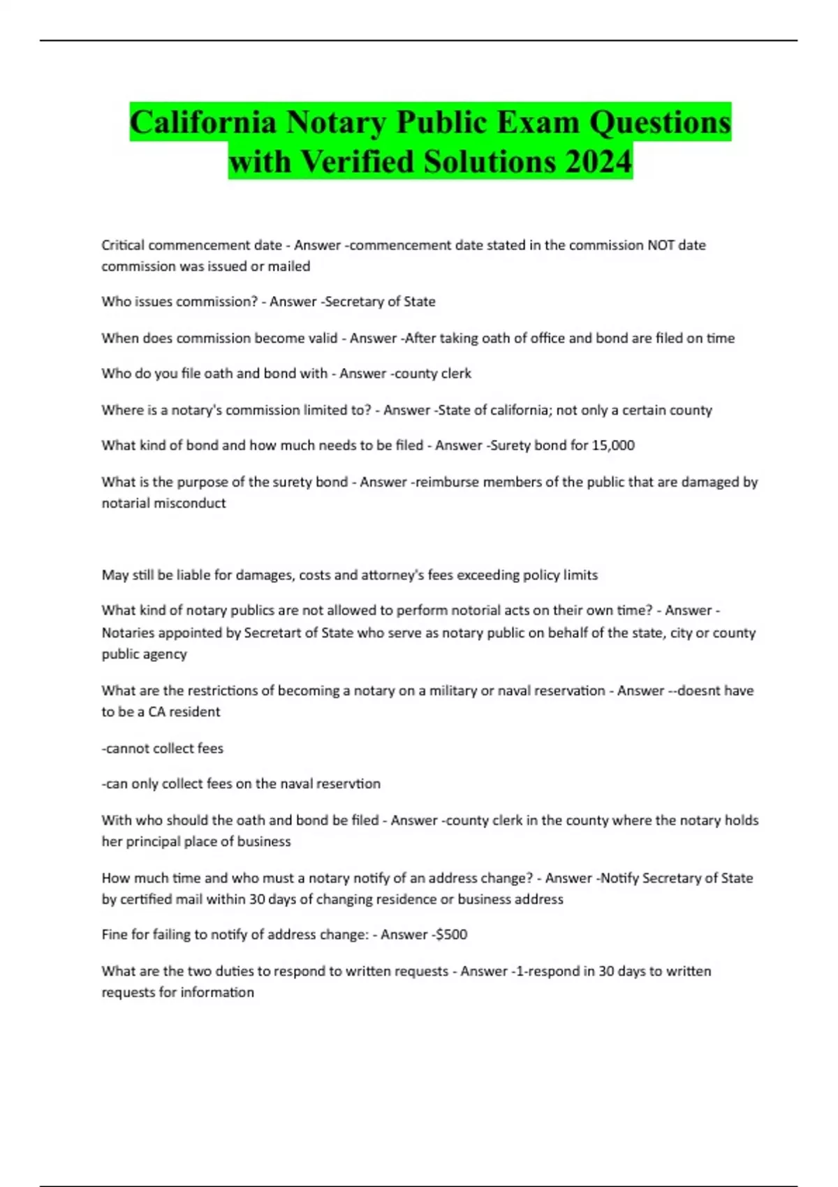 California Notary Public Exam Questions with Verified Solutions 2024 Critical commencement date - Answer -commencement date stated in the commission NOT date commission was issued or mailed Who issues commission? - Answer -Secretary of State When does commission become valid - Answer -After taking oath of office and bond are filed on time Who do you file oath and bond with - Answer -county clerk Where is a notary's commission limited to? - Answer -State of california; not only a certain county What kind of bond and how much needs to be filed - Answer -Surety bond for 15,000 What is the purpose of the surety bond - Answer -reimburse members of the public that are damaged by notarial misconduct May still be liable for damages, costs and attorney's fees exceeding policy limits What kind of notary publics are not allowed to perform notorial acts on their own time? - Answer - Notaries appointed by Secretart of State who serve as notary public on behalf of the state, city or county public agency What are the restrictions of becoming a notary on a military or naval reservation - Answer --doesnt have to be a CA resident -cannot collect fees -can only collect fees on the naval reservtion With who should the oath and bond be filed - Answer -county clerk in the county where the notary holds her principal place of business How much time and who must a notary notify of an address change? - Answer -Notify Secretary of State by certified mail within 30 days of changing residence or business address Fine for failing to notify of address change: - Answer -$500 What are the two duties to respond to written requests - Answer -1-respond in 30 days to written requests for information2-respond in time specified when certified copies of journal are requested Can an employer request that fees be turned over to employer? - Answer -yes. How many journals can a notary keep - Answer -one Who can request photostatic copies of a notary's journal? - Answer --any member of the general public can request to see their line item in the journal What must the request include when requesting copies of a notorial journal - Answer --Name o