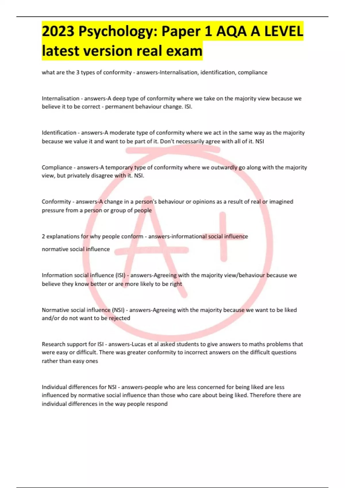 2023 Psychology: Paper 1 AQA A LEVEL latest version real exam what are the 3 types of conformity - answers-Internalisation, identification, compliance Internalisation - answers-A deep type of conformity where we take on the majority view because we believe it to be correct - permanent behaviour change. ISI.