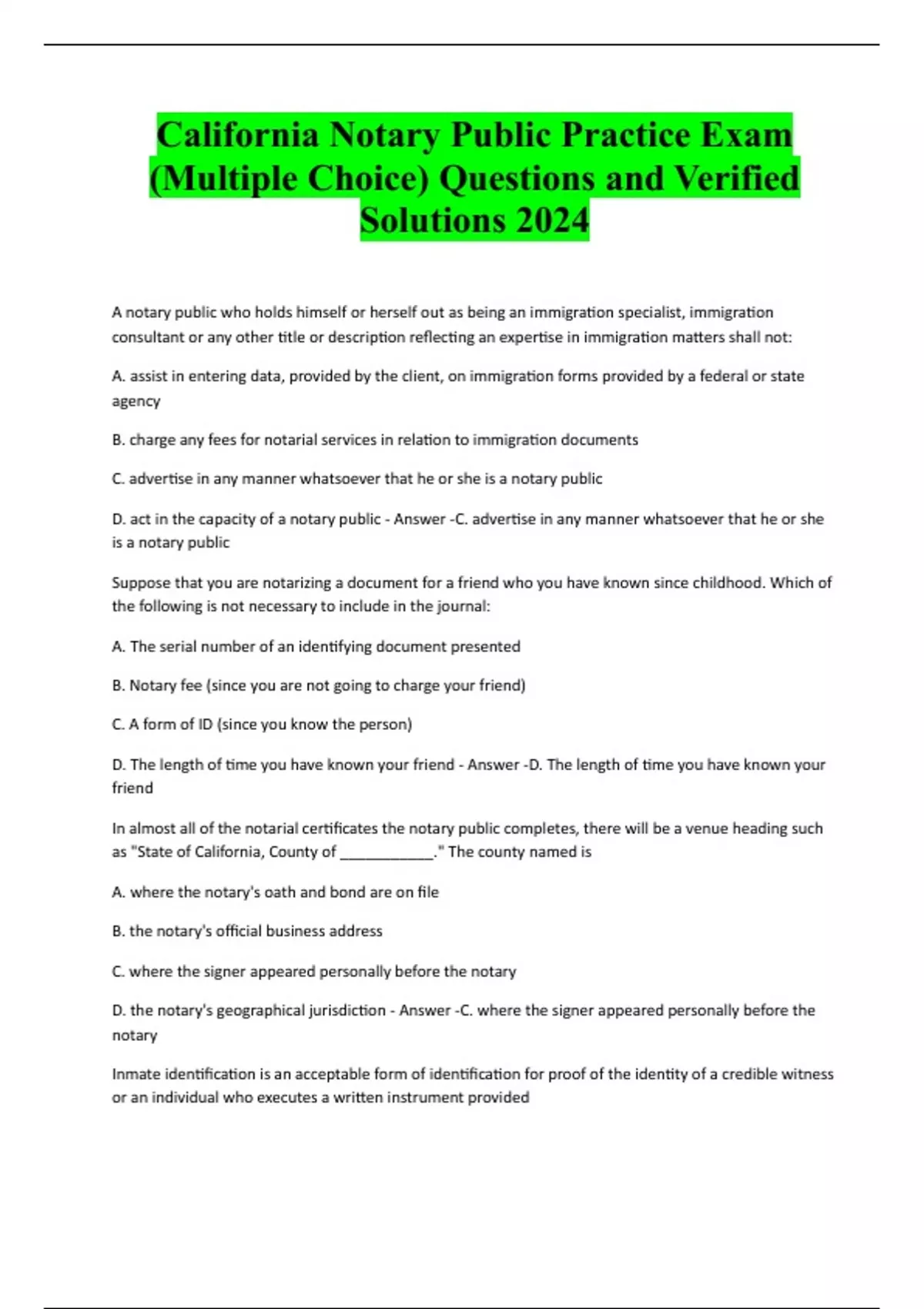 California Notary Public Practice Exam (Multiple Choice) Questions and Verified Solutions 2024 A notary public who holds himself or herself out as being an immigration specialist, immigration consultant or any other title or description reflecting an expertise in immigration matters shall not: A. assist in entering data, provided by the client, on immigration forms provided by a federal or state agency B. charge any fees for notarial services in relation to immigration documents C. advertise in any manner whatsoever that he or she is a notary public D. act in the capacity of a notary public - Answer -C. advertise in any manner whatsoever that he or she is a notary public Suppose that you are notarizing a document for a friend who you have known since childhood. Which of the following is not necessary to include in the journal: A. The serial number of an identifying document presented B. Notary fee (since you are not going to charge your friend) C. A form of ID (since you know the person) D. The length of time you have known your friend - Answer -D. The length of time you have known your friend In almost all of the notarial certificates the notary public completes, there will be a venue heading such as "State of California, County of ___________." The county named is A. where the notary's oath and bond are on file B. the notary's official business address C. where the signer appeared personally before the notary D. the notary's geographical jurisdiction - Answer -C. where the signer appeared personally before the notary Inmate identification is an acceptable form of identification for proof of the identity of a credible witness or an individual who executes a written instrument providedA. (**) The inmate is in custody in a local detention facility. B. Both (*) and (**) C. None of the above and/or below answers D. (*) The inmate identification is current or has been issued within 5 years by a sheriff's departmen