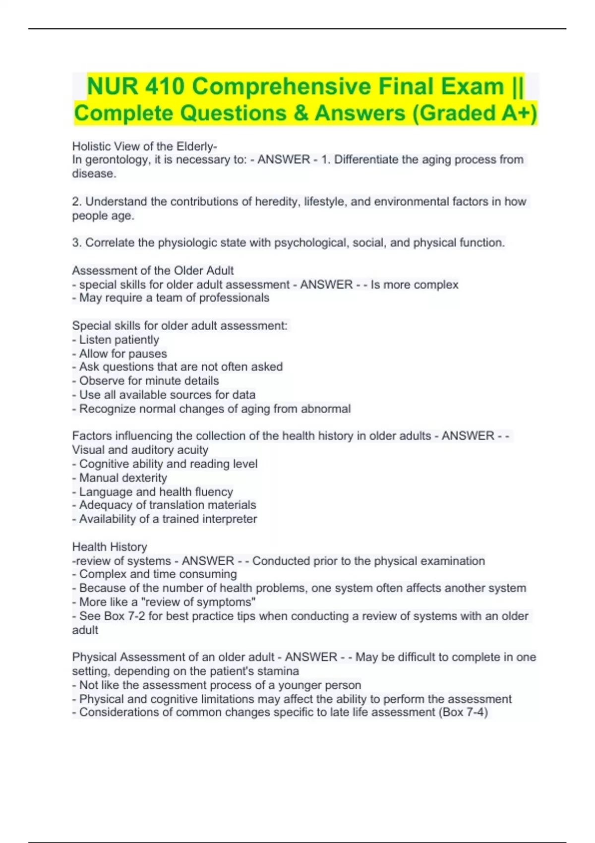 Factors influencing the collection of the health history in older adults - ANSWER - - Visual and auditory acuity