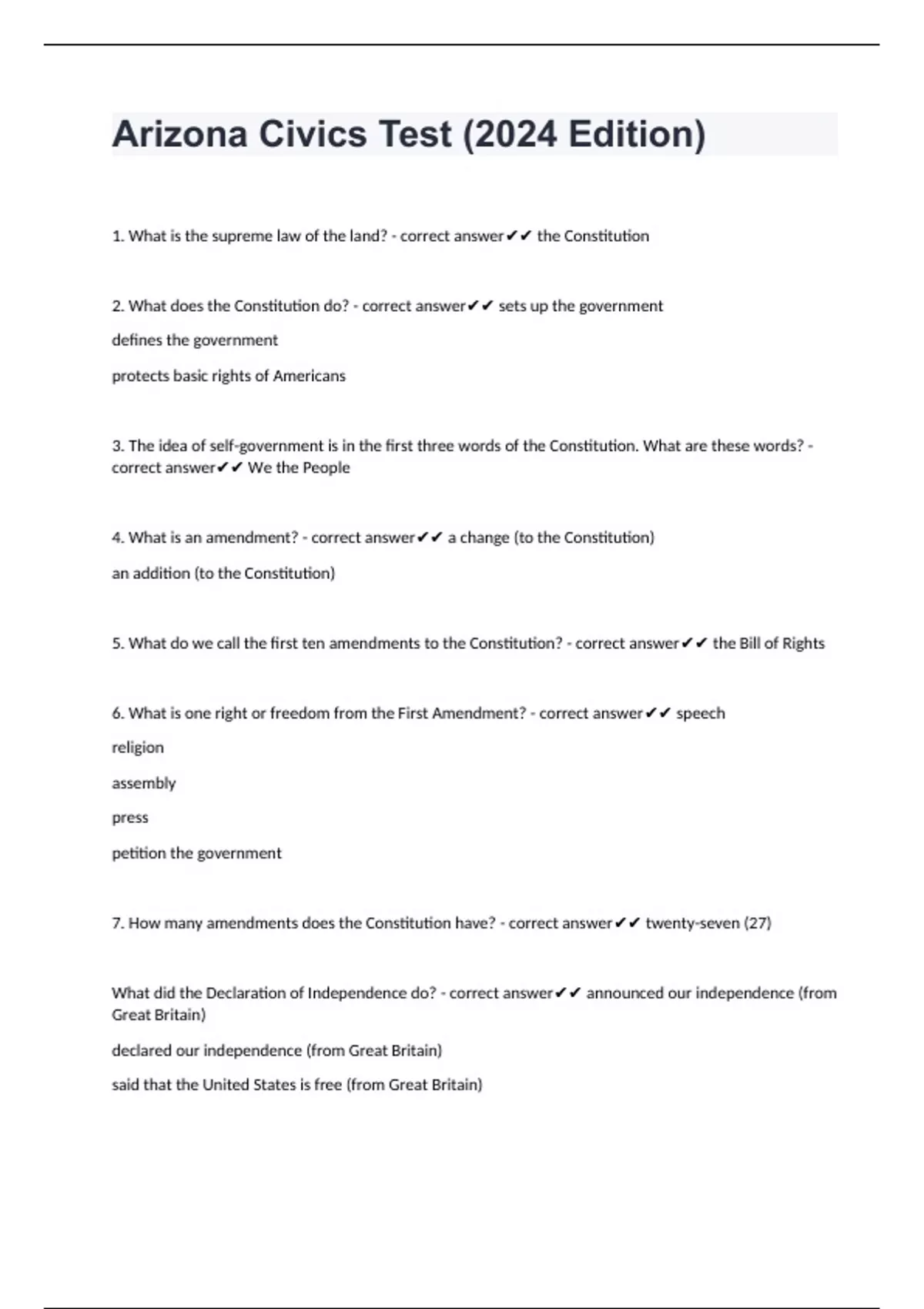 Arizona Civics Test (2024 Edition) 1. What is the supreme law of the land? - correct answer the Constitution 2. What does the Constitution do? - correct answer sets up the government defines the government protects basic rights of Americans 3. The idea of self-government is in the first three words of the Constitution. What are these words? - correct answer We the People 4. What is an amendment? - correct answer a change (to the Constitution) an addition (to the Constitution) 5. What do we call the first ten amendments to the Constitution? - correct answer the Bill of Rights 6. What is one right or freedom from the First Amendment? - correct answer speech religion assembly press petition the government 7. How many amendments does the Constitution have? - correct answer twenty-seven (27) What