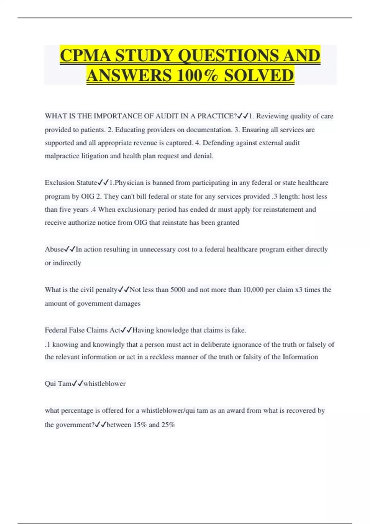 CPMA STUDY QUESTIONS AND ANSWERS 100% SOLVED WHAT IS THE IMPORTANCE OF AUDIT IN A PRACTICE?1. Reviewing quality of care provided to patients. 2. Educating providers on documentation. 3. Ensuring all services are supported and all appropriate revenue is captured. 4. Defending against external audit malpractice litigation and health plan request and denial. Exclusion Statute1.Physician is banned from participating in any federal or state healthcare program by OIG 2. They can't bill federal or state for any services provided .3 length: host less than five years .4 When exclusionary period has ended dr must apply for reinstatement and receive authorize notice from OIG that reinstate has been granted AbuseIn action resulting in unnecessary cost to a federal healthcare program either directly or indirectly What is the civil penaltyNot less than 5000 and not more than 10,000 per claim x3 times the amount of government damages Federal False Claims ActHaving knowledge that claims is fake. .1 knowing and knowingly that a person must act in deliberate ignorance of the truth or falsely of the relevant information or act in a reckless manner of the truth or falsity of the Information Qui Tamwhistleblower