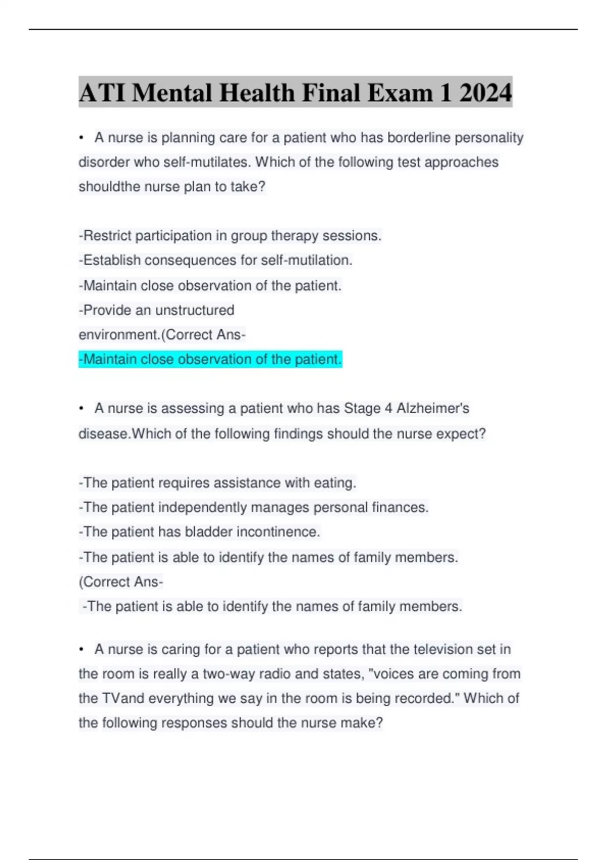 ATI Mental Health Final Exam 1 2024