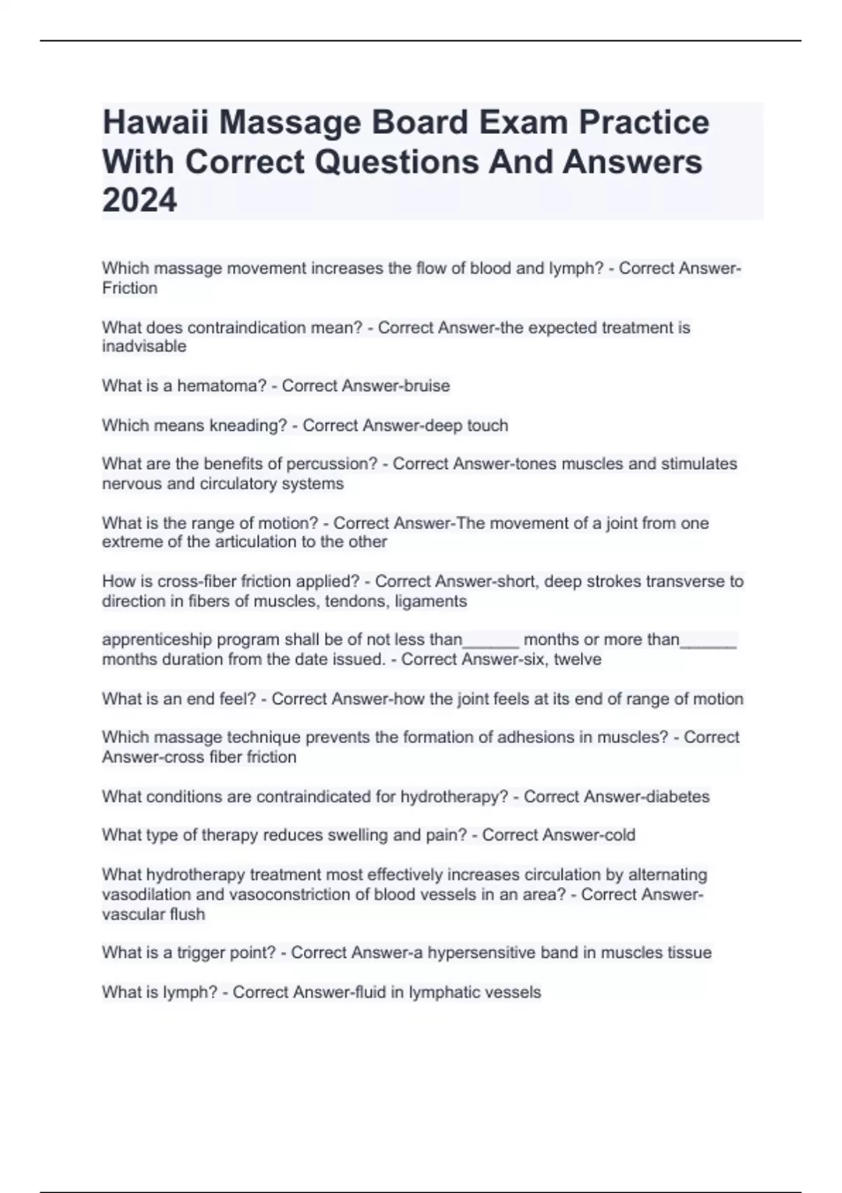 Hawaii Massage Board Exam Practice With Correct Questions And Answers 2024