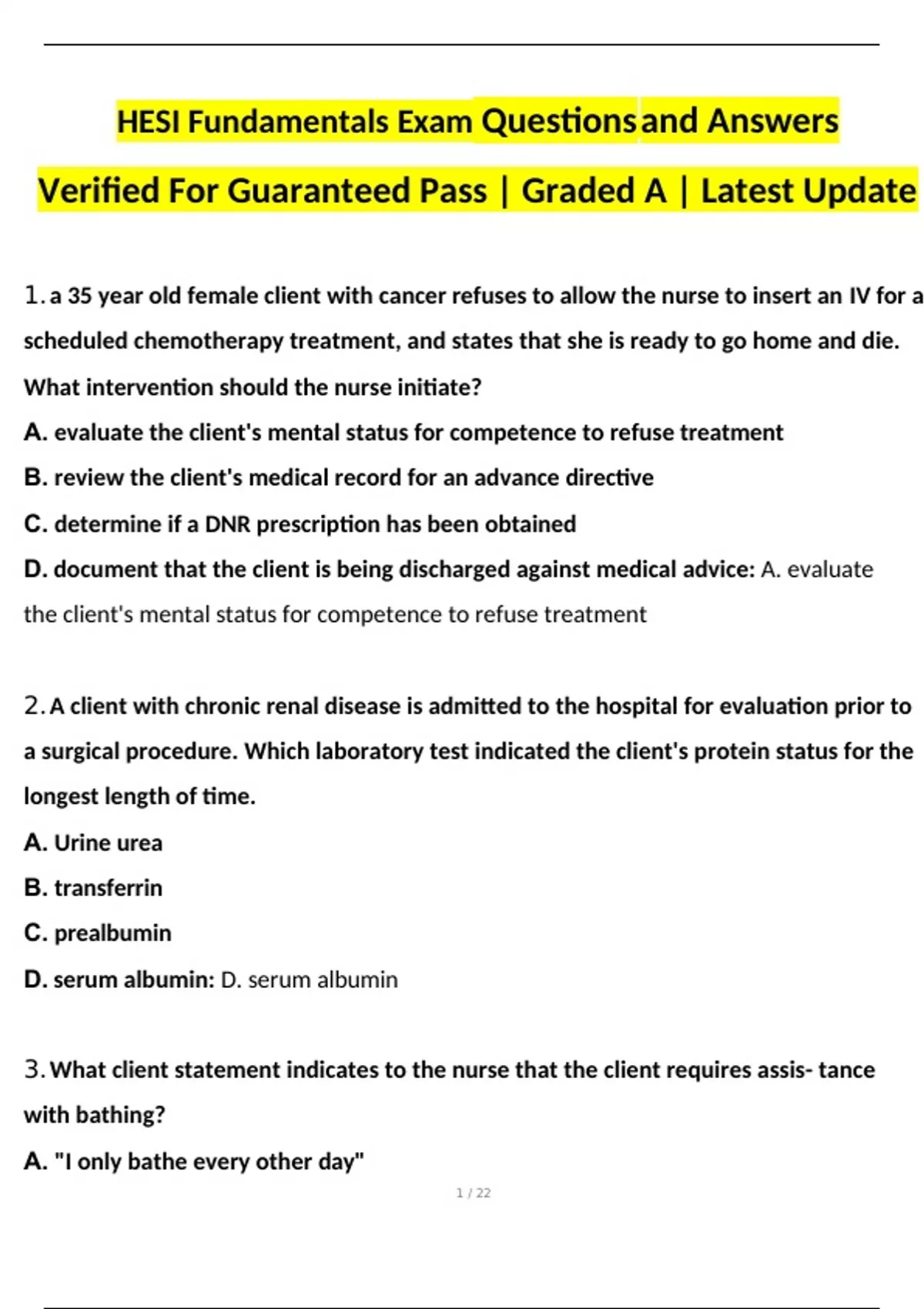 HESI Fundamentals Exam 2024 Questions and Answers Verified For Guaranteed Pass | Graded A | Latest Update HESI Fundamentals Exam 2024 Questions and Answers Verified For Guaranteed Pass | Graded A | Latest Update HESI Fundamentals Exam 2024 Questions and Answers Verified For Guaranteed Pass | Graded A | Latest Update HESI Fundamentals Exam Questions and Answers Verified For Guaranteed Pass | Graded A | Latest Update 1. a 35 year old female client with cancer refuses to allow the nurse to insert an IV for a scheduled chemotherapy treatment, and states that she is ready to go home and die. What intervention should the nurse initiate? A. evaluate the client's mental status for competence to refuse treatment B. review the client's medical record for an advance directive C. determine if a DNR prescription has been obtained D. document that the client is being discharged against medical advice: A. evaluate the client's mental status for competence to refuse treatment 2. A client with chronic renal disease is admitted to the hospital for evaluation prior to a surgical procedure. Which laboratory test indicated the client's protein status for the longest length of time. A. Urine urea B. transferrin C. prealbumin D. serum albumin: D. serum albumin 3. What client statement indicates to the nurse that the client requires assis- tance with bathing? A. "I only bathe every other day" B. "I left my eyeglasses at home" C. "I don't understand why I'm so weak and tired" D. "I wasn't able to pack a bag before I left for the hospital": C. "I don't understand why I'm so weak and tired" 4. How should a nurse handle linens that are soiled with incontinent feces? A. Place the soiled linens in a pillow case and deposit them in the dirty linen hamper B. put the soiled linens in an isolation bag, then place it in the dirty linen hamper C. Ask the housekeeping staff to pick up the soiled linen from the dirty utility room D. place an isolation hamper in the client's room and discard the linens in it: D. place an isolation hamper in the client's room and discard the linens in it 5. When caring for an immobile client, what nursing diagnosis has the highest priority? A. altered tissue perfusion B. impaired gas exchange C. risk for fluid volume deficit D. risk for impaired skin integrity: B. impaired gas exchange 6. The nurse assess an immobile, elderly male client and determines that his blood pressure is 138/60, his temperature is 95.8F, and his output is 100 mL of concentrated urine during the last hour. He has wet-sounding lung sounds, and increased respiratory secretions. Based on these assessment findings, what nursing action is the most important for the nurse to implement? A. encourage additional additional fluid intake B. provide the client with an additional blanket C. turn the patient D. administer a PRN anti hypertensive prescription: C. turn the patient
