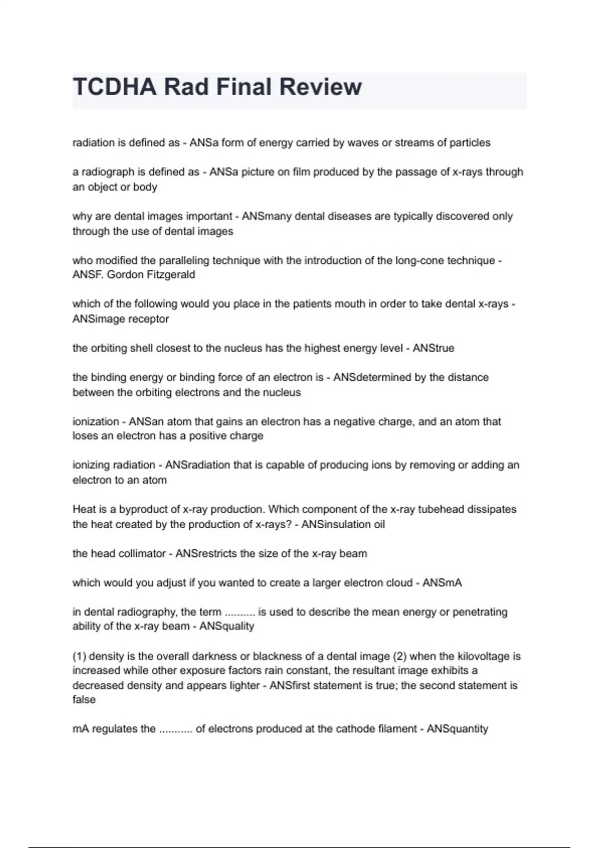 TCDHA Rad Final Review questions and answers graded A+ by experts 2024/2025