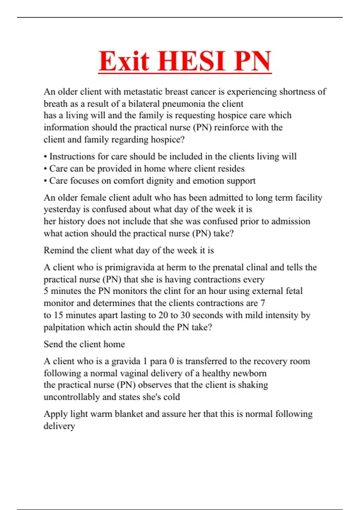 Exit HESI PN An older client with metastatic breast cancer is experiencing shortness of breath as a result of a bilateral pneumonia the client has a living will and the family is requesting hospice care which information should the practical nurse (PN) reinforce with the client and family regarding hospice? • Instructions for care should be included in the clients living will • Care can be provided in home where client resides • Care focuses on comfort dignity and emotion support An older female client adult who has been admitted to long term facility yesterday is confused about what day of the week it is her history does not include that she was confused prior to admission what action should the practical nurse (PN) take? Remind the client what day of the week it is A client who is primigravida at herm to the prenatal clinal and tells the practical nurse (PN) that she is having contractions every 5 minutes the PN monitors the clint for an hour using external fetal monitor and determines that the clients contractions are 7 to 15 minutes apart lasting to 20 to 30 seconds with mild intensity by palpitation which actin should the PN take? Send the client home A client who is a gravida 1 para 0 is transferred to the recovery room following a normal vaginal delivery of a healthy newborn the practical nurse (PN) observes that the client is shaking uncontrollably and states she's cold Apply light warm blanket and assure her that this is normal following delivery The practical nurse (PN) is assessing an older client with left sided heart failure what intervention is most important for the PN to implement Auscultate all the lung fields