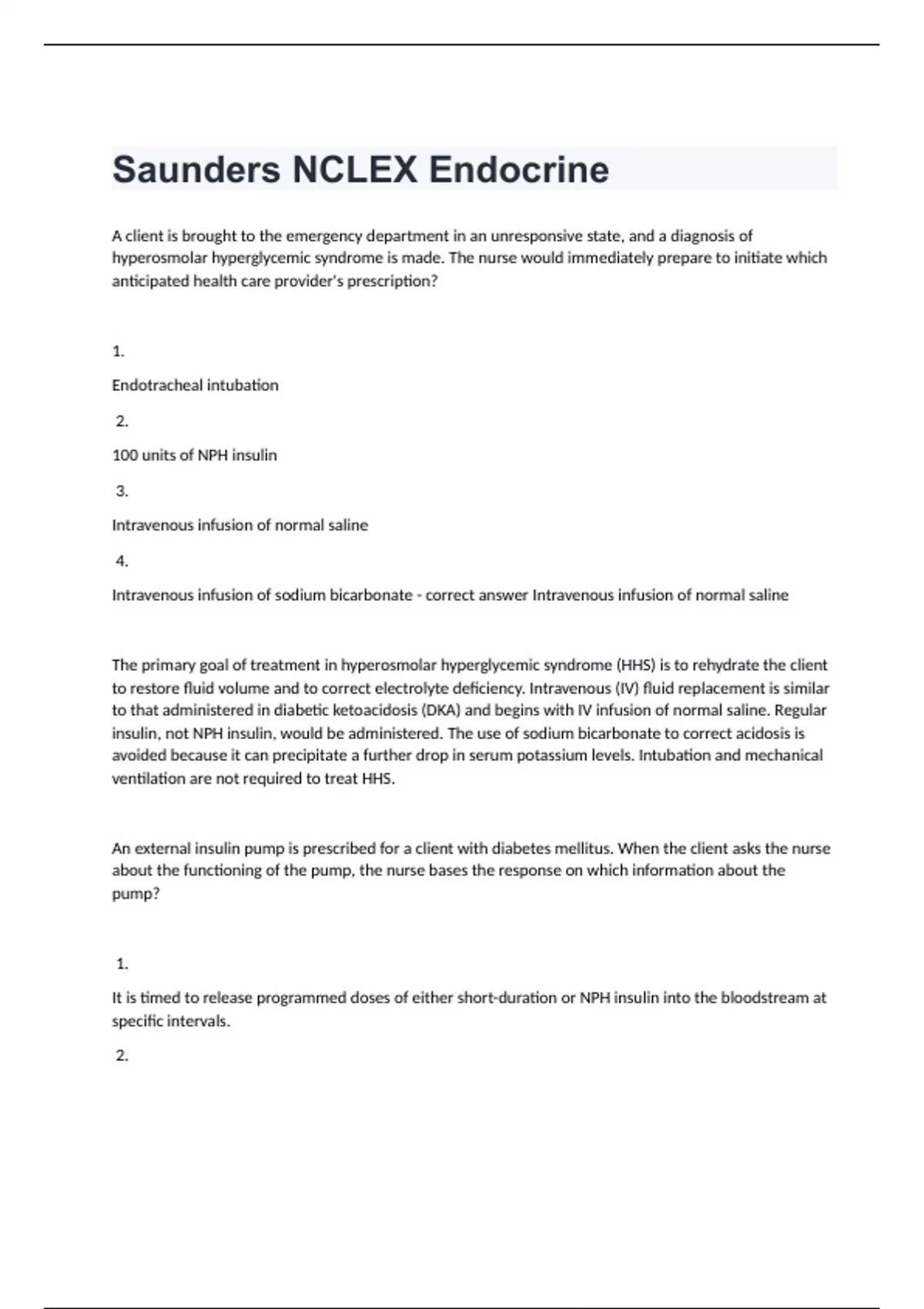 Saunders NCLEX EndocrineA client is brought to the emergency department in an unresponsive state, and a diagnosis of hyperosmolar hyperglycemic syndrome is made. The nurse would immediately prepare to initiate which anticipated health care provider's prescription? 1. Endotracheal intubation 2. 100 units of NPH insulin 3. Intravenous infusion of normal saline 4. Intravenous infusion of sodium bicarbonate - correct answer Intravenous infusion of normal saline The primary goal of treatment in hyperosmolar hyperglycemic syndrome (HHS) is to rehydrate the client to restore fluid volume and to correct electrolyte deficiency. Intravenous (IV) fluid replacement is similar to that administered in diabetic ketoacidosis (DKA) and begins with IV infusion of normal saline. Regular insulin, not NPH insulin, would be administered. The use of sodium bicarbonate to correct acidosis is avoided because it can precipitate a further drop in serum potassium levels. Intubation and mechanical ventilation are not required to treat HHS. An external insulin pump is prescribed for a client with diabetes mellitus. When the client asks the nurse about the functioning of the pump, the nurse bases the response on which information about the pump? 1. It is timed to release programmed doses of either short-duration or NPH insulin into the bloodstream at specific intervals. 2.