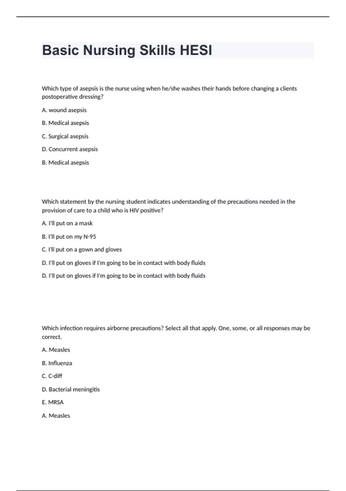 Basic Nursing Skills HESI HESI Nursing Nightingale College - Questions with complete solved 2024 Basic Nursing Skills HESI Which type of asepsis is the nurse using when he/she washes their hands before changing a clients postoperative dressing? A. wound asepsis B. Medical asepsis C. Surgical asepsis D. Concurrent asepsis B. Medical asepsis Which statement by the nursing student indicates understanding of the precautions needed in the provision of care to a child who is HIV positive? A. I'll put on a mask B. I'll put on my N-95 C. I'll put on a gown and gloves D. I'll put on gloves if I'm going to be in contact with body fluids D. I'll put on gloves if I'm going to be in contact with body fluids Which infection requires airborne precautions? Select all that apply. One, some, or all responses may be correct. A. Measles B. Influenza C. C-diff D. Bacterial meningitis E. MRSA A. Measles