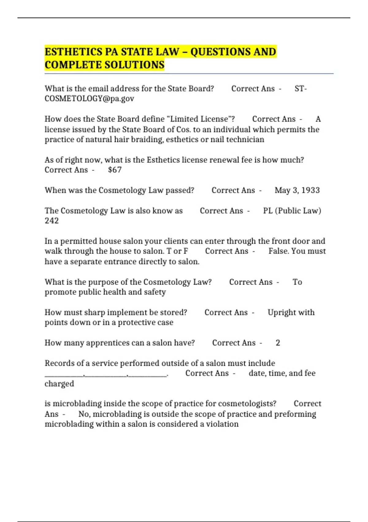 ESTHETICS PA STATE LAW – QUESTIONS AND COMPLETE SOLUTIONS