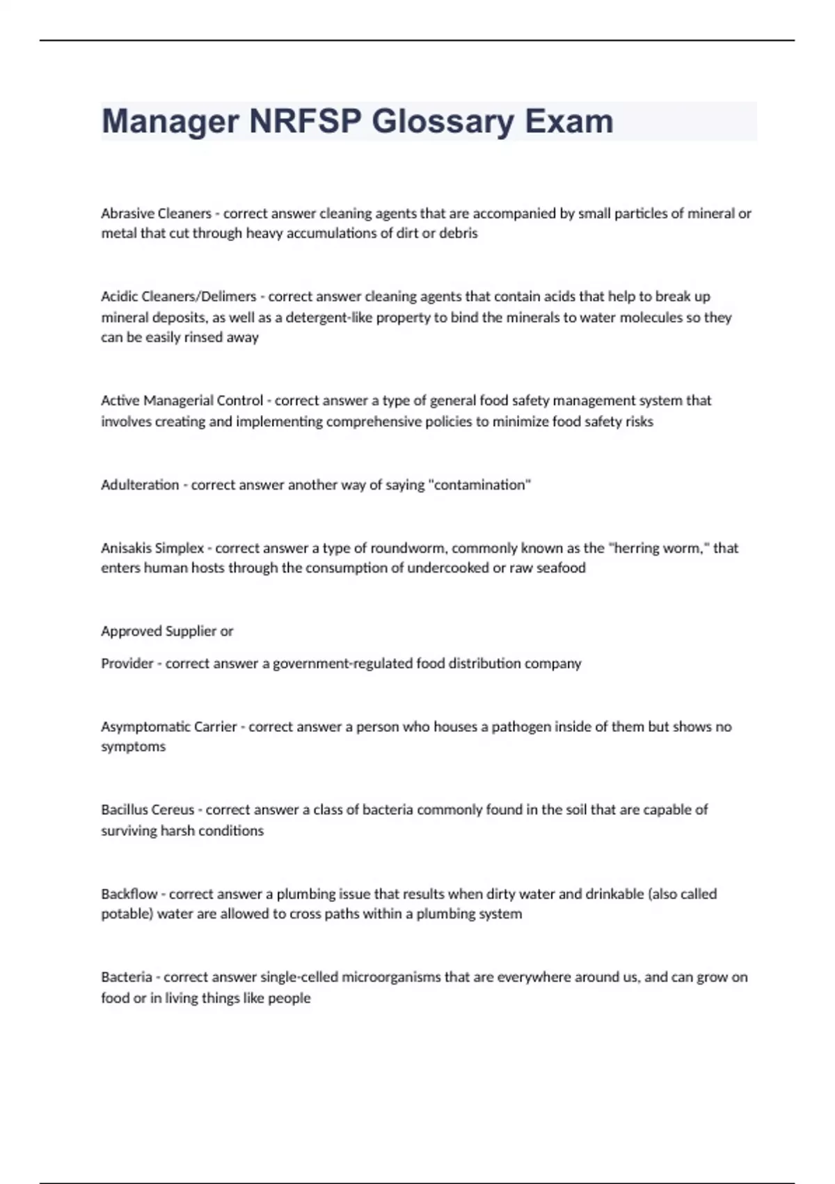 Manager NRFSP Glossary Exam Question and answers rated A+ 2024 Manager NRFSP Glossary Exam Abrasive Cleaners - correct answer cleaning agents that are accompanied by small particles of mineral or metal that cut through heavy accumulations of dirt or debris Acidic Cleaners/Delimers - correct answer cleaning agents that contain acids that help to break up mineral deposits, as well as a detergent-like property to bind the minerals to water molecules so they can be easily rinsed away Active Managerial Control - correct answer a type of general food safety management system that involves creating and implementing comprehensive policies to minimize food safety risks Adulteration - correct answer another way of saying "contamination" Anisakis Simplex - correct answer a type of roundworm, commonly known as the "herring worm," that enters human hosts through the consumption of undercooked or raw seafood Approved Supplier or Provider - correct answer a government-regulated food distribution company Asymptomatic Carrier - correct answer a person who houses a pathogen inside of them but shows no symptoms