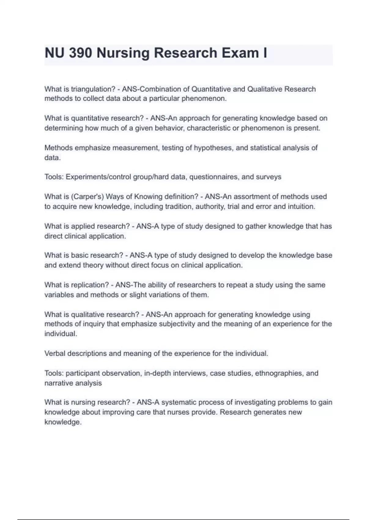 NU 390 Nursing Research Exam I with complete solution