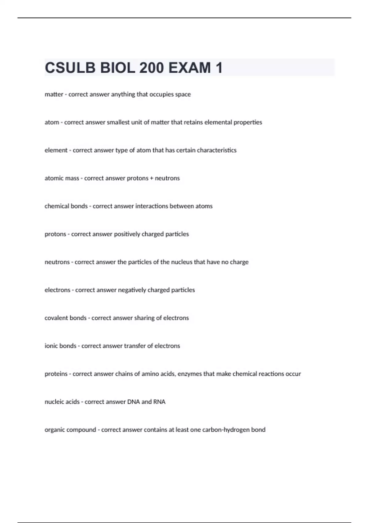 CSULB BIOL 200 EXAM 1 Questions with complete solution 2024CSULB BIOL 200 EXAM 1 matter - correct answer anything that occupies space atom - correct answer smallest unit of matter that retains elemental properties element - correct answer type of atom that has certain characteristics atomic mass - correct answer protons + neutrons chemical bonds - correct answer interactions between atoms protons - correct answer positively charged particles neutrons - correct answer the particles of the nucleus that have no charge electrons - correct answer negatively charged particles covalent bonds - correct answer sharing of electrons ionic bonds - correct answer transfer of electrons proteins - correct answer chains of amino acids, enzymes that make chemical reactions occur nucleic acids - correct answer DNA and RNA organic compound - correct answer contains at least one carbon-hydrogen bond inorganic compound - correct answer does not contain carbon-hydrogen bond