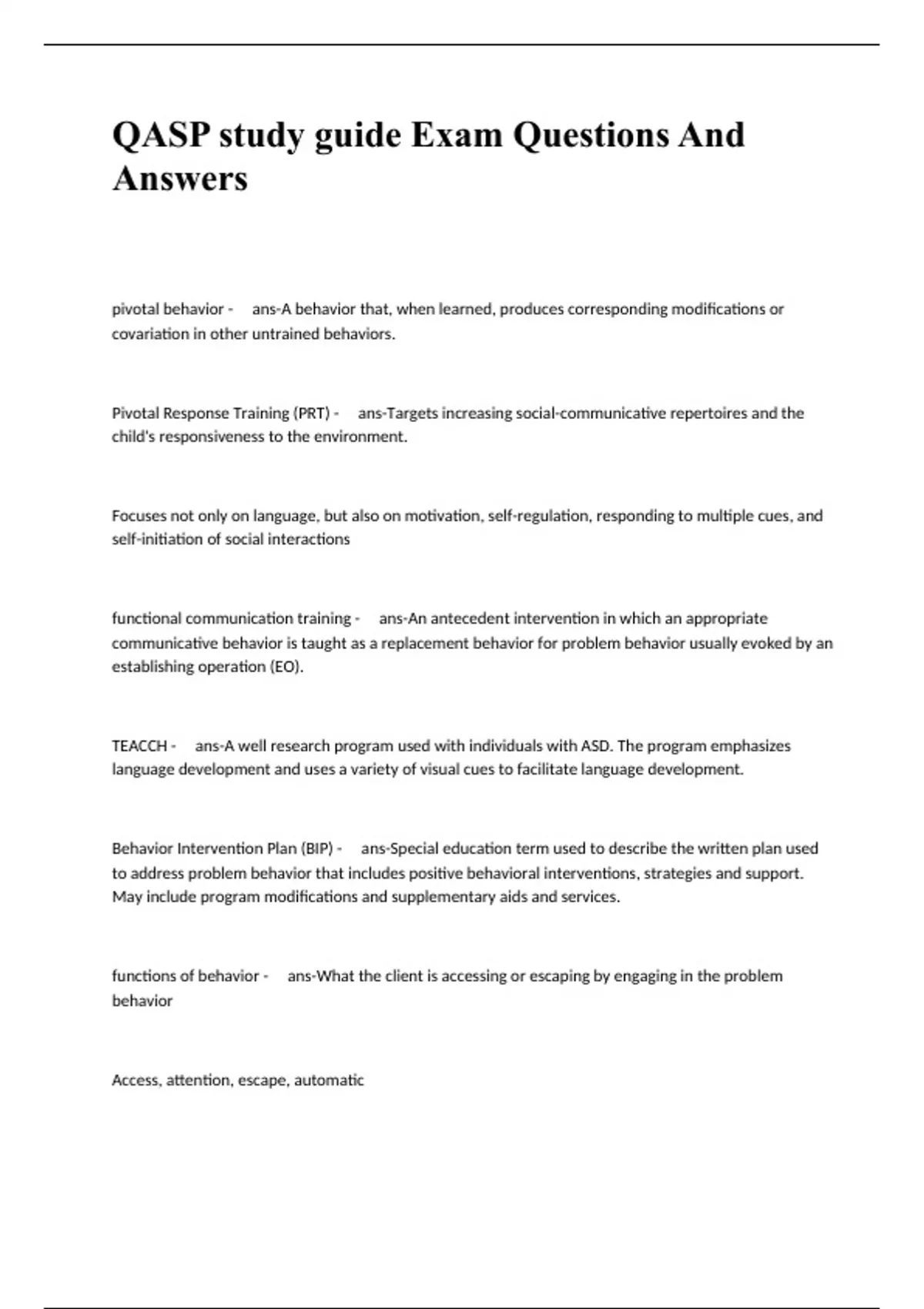 pivotal behavior - ans-A behavior that, when learned, produces corresponding modifications or covariation in other untrained behaviors. Pivotal Response Training (PRT) - ans-Targets increasing social-communicative repertoires and the child's responsiveness to the environment. Focuses not only on language, but also on motivation, self-regulation, responding to multiple cues, and self-initiation of social interactions functional communication training - ans-An antecedent intervention in which an appropriate communicative behavior is taught as a replacement behavior for problem behavior usually evoked by an establishing operation (EO). TEACCH - ans-A well research program used with individuals with ASD. The program emphasizes language development and uses a variety of visual cues to facilitate language development. Behavior Intervention Plan (BIP) - ans-Special education term used to describe the written plan used to address problem behavior that includes positive behavioral interventions, strategies and support. May include program modifications and supplementary aids and services. functions of behavior - ans-What the client is accessing or escaping by engaging in the problem behavior