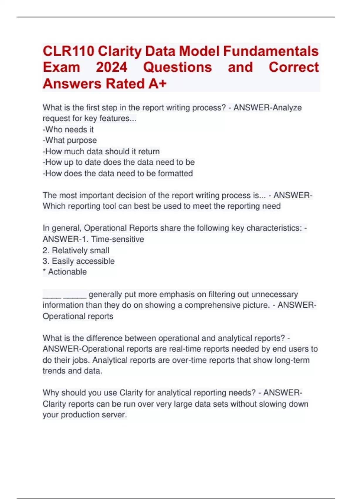 CLR110 Clarity Data Model Fundamentals Exam 2024 Questions and Correct Answers Rated A+ What is the first step in the report writing process? - ANSWER -Analyze request for key features... -Who needs it -What purpose -How much data should it return -How up to date does the data need to be -How does the data need to be formatted The most important decision of the report writing process is... - ANSWER -