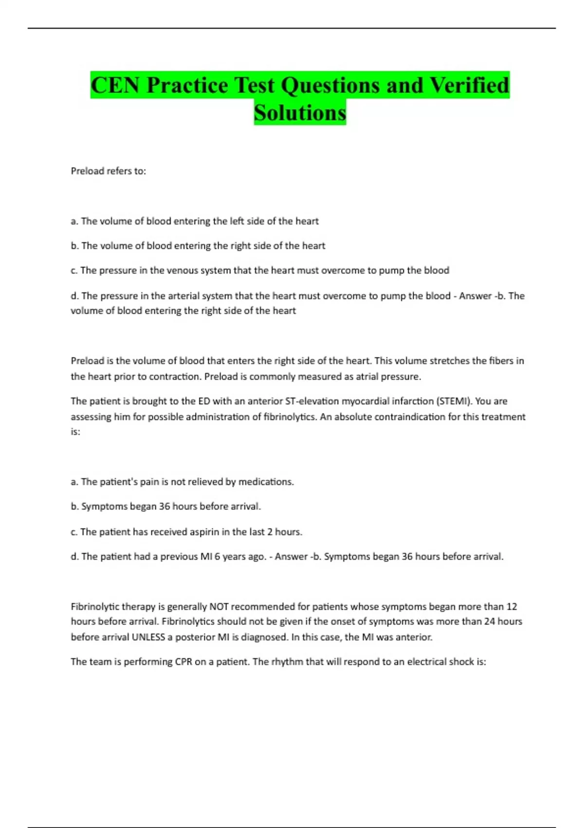 CEN Practice Test Questions and Verified Solutions Preload refers to: a. The volume of blood entering the left side of the heart b. The volume of blood entering the right side of the heart c. The pressure in the venous system that the heart must overcome to pump the blood d. The pressure in the arterial system that the heart must overcome to pump the blood - Answer -b. The volume of blood entering the right side of the heart Preload is the volume of blood that enters the right side of the heart. This volume stretches the fibers in the heart prior to contraction. Preload is commonly measured as atrial pressure. The patient is brought to the ED with an anterior ST-elevation myocardial infarction (STEMI). You are assessing him for possible administration of fibrinolytics. An absolute contraindication for this treatment is: a. The patient's pain is not relieved by medications. b. Symptoms began 36 hours before arrival. c. The patient has received aspirin in the last 2 hours. d. The patient had a previous MI 6 years ago. - Answer -b. Symptoms began 36 hours before arrival. Fibrinolytic therapy is generally NOT recommended for patients whose symptoms began more than 12 hours before arrival. Fibrinolytics should not be given if the onset of symptoms was more than 24 hours before arrival UNLESS a posterior MI is diagnosed. In this case, the MI was anterior. The team is performing CPR on a patient. The rhythm that will respond to an electrical shock is:a. Asystole b. PEA c. Ventricular fibrillation