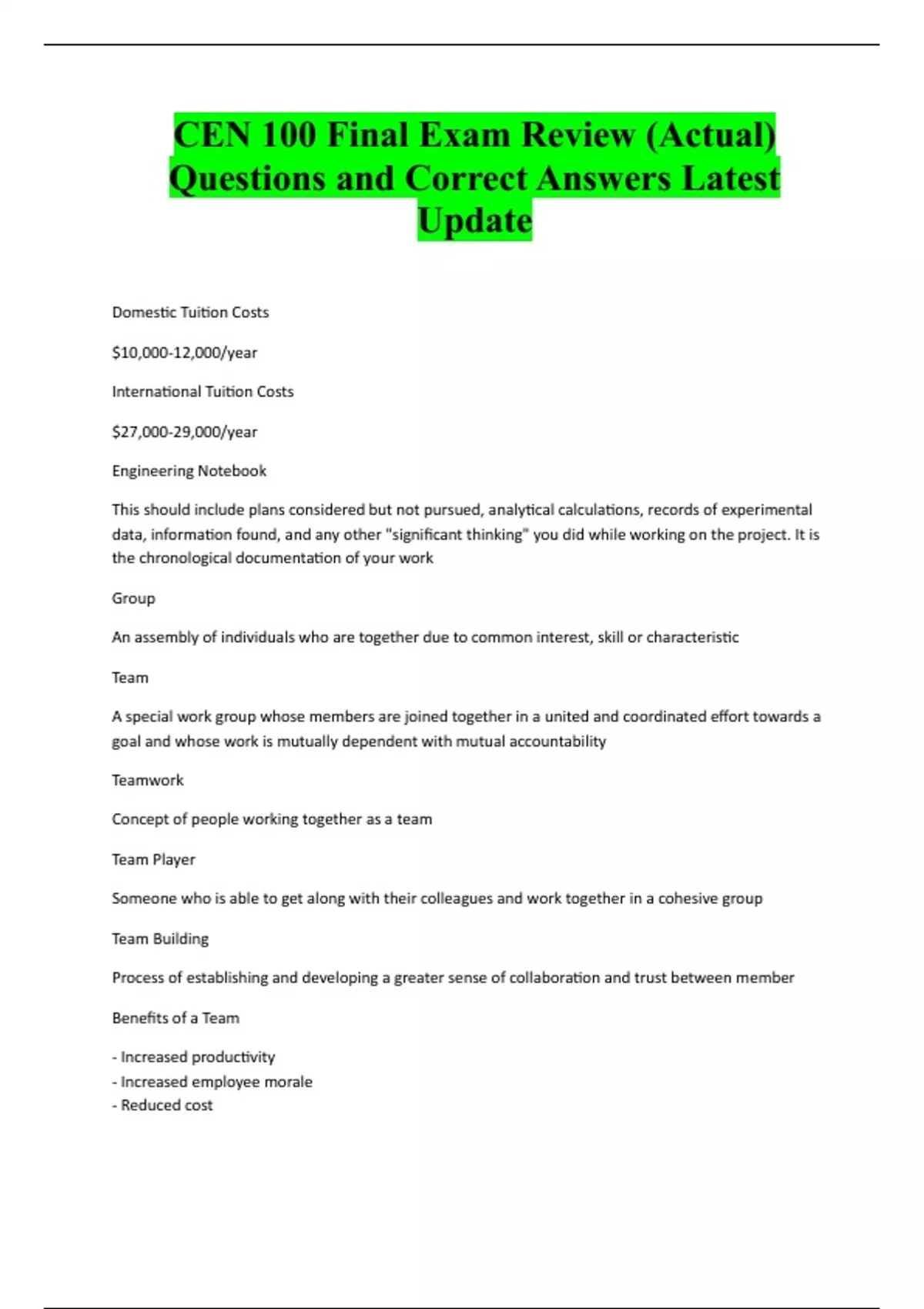 CEN 100 Final Exam Review (Actual) Questions and Correct Answers Latest Update Domestic Tuition Costs $10,000-12,000/year International Tuition Costs $27,000-29,000/year Engineering Notebook This should include plans considered but not pursued, analytical calculations, records of experimental data, information found, and any other "significant thinking" you did while working on the project. It is the chronological documentation of your work Group An assembly of individuals who are together due to common interest, skill or characteristic Team A special work group whose members are joined together in a united and coordinated effort towards a goal and whose work is mutually dependent with mutual accountability Teamwork Concept of people working together as a team Team Player Someone who is able to get along with their colleagues and work together in a cohesive group Team Building Process of establishing and developing a greater sense of collaboration and trust between member Benefits of a Team - Increased productivity - Increased employee morale - Reduced cost- Increased quality - Decreased losses - Increased profits