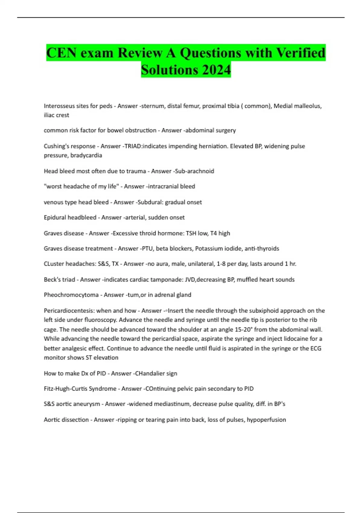 CEN exam Review A Questions with Verified Solutions 2024 Interosseus sites for peds - Answer -sternum, distal femur, proximal tibia ( common), Medial malleolus, iliac crest common risk factor for bowel obstruction - Answer -abdominal surgery Cushing's response - Answer -TRIAD:indicates impending herniation. Elevated BP, widening pulse pressure, bradycardia Head bleed most often due to trauma - Answer -Sub-arachnoid "worst headache of my life" - Answer -intracranial bleed venous type head bleed - Answer -Subdural: gradual onset Epidural headbleed - Answer -arterial, sudden onset Graves disease - Answer -Excessive throid hormone: TSH low, T4 high Graves disease treatment - Answer -PTU, beta blockers, Potassium iodide, anti-thyroids CLuster headaches: S&S, TX - Answer -no aura, male, unilateral, 1-8 per day, lasts around 1 hr. Beck's triad - Answer -indicates cardiac tamponade: JVD,decreasing BP, muffled heart sounds Pheochromocytoma - Answer -tum,or in adrenal gland Pericardiocentesis: when and how - Answer -◦Insert the needle through the subxiphoid approach on the left side under fluoroscopy. Advance the needle and syringe until the needle tip is posterior to the rib cage. The needle should be advanced toward the shoulder at an angle 15-20° from the abdominal wall. While advancing the needle toward the pericardial space, aspirate the syringe and inject lidocaine for a better analgesic effect. Continue to advance the needle until fluid is aspirated in the syringe or the ECG monitor shows ST elevation How to make Dx of PID - Answer -CHandalier sign