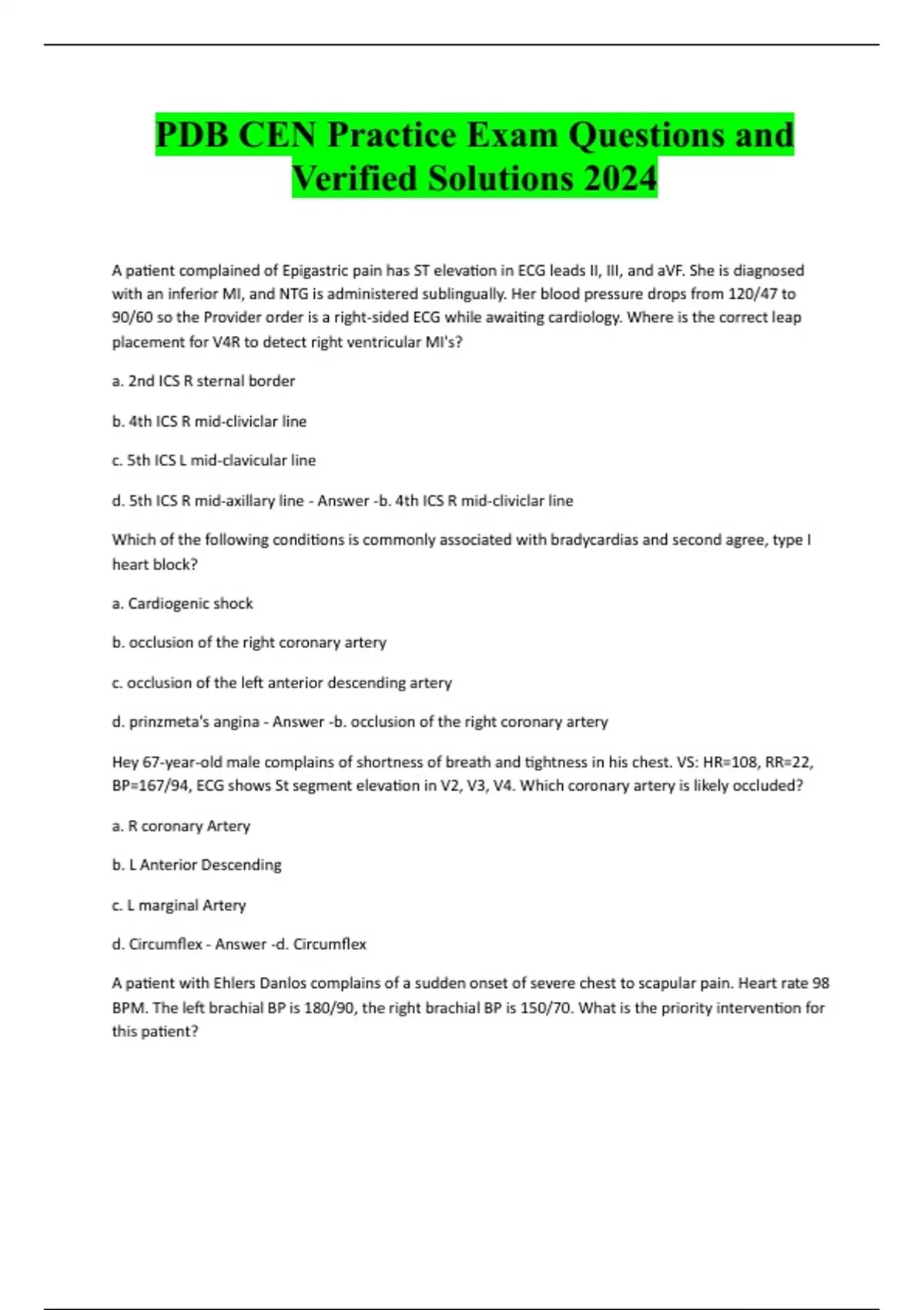 PDB CEN Practice Exam Questions and Verified Solutions 2024 A patient complained of Epigastric pain has ST elevation in ECG leads II, III, and aVF. She is diagnosed with an inferior MI, and NTG is administered sublingually. Her blood pressure drops from 120/47 to 90/60 so the Provider order is a right-sided ECG while awaiting cardiology. Where is the correct leap placement for V4R to detect right ventricular MI's? a. 2nd ICS R sternal border b. 4th ICS R mid-cliviclar line c. 5th ICS L mid-clavicular line d. 5th ICS R mid-axillary line - Answer -b. 4th ICS R mid-cliviclar line Which of the following conditions is commonly associated with bradycardias and second agree, type I heart block? a. Cardiogenic shock b. occlusion of the right coronary artery c. occlusion of the left anterior descending artery d. prinzmeta's angina - Answer -b. occlusion of the right coronary artery Hey 67-year-old male complains of shortness of breath and tightness in his chest. VS: HR=108, RR=22, BP=167/94, ECG shows St segment elevation in V2, V3, V4. Which coronary artery is likely occluded? a. R coronary Artery b. L Anterior Descending c. L marginal Artery d. Circumflex - Answer -d. Circumflex A patient with Ehlers Danlos complains of a sudden onset of severe chest to scapular pain. Heart rate 98 BPM. The left brachial BP is 180/90, the right brachial BP is 150/70. What is the priority intervention for this patient?a. Initiate oxygen via NRB mask and start two large-bore IV's b. Administer sublingual nitroglycerin to lower blood pressure and relieve pain c. administer Labetalol to lower heart rate d. infuse nitroprusside (Nipride) to rapidly lower BP - Answer -a. Initiate oxygen via NRB mask and start two large bore IV's What is the priority intervention for the patient and pulseless polymorphic ventricular tachycardia? a. Intubate a patient so you can provide continuous compressions. b. administer Epinephrine 1 mg IV