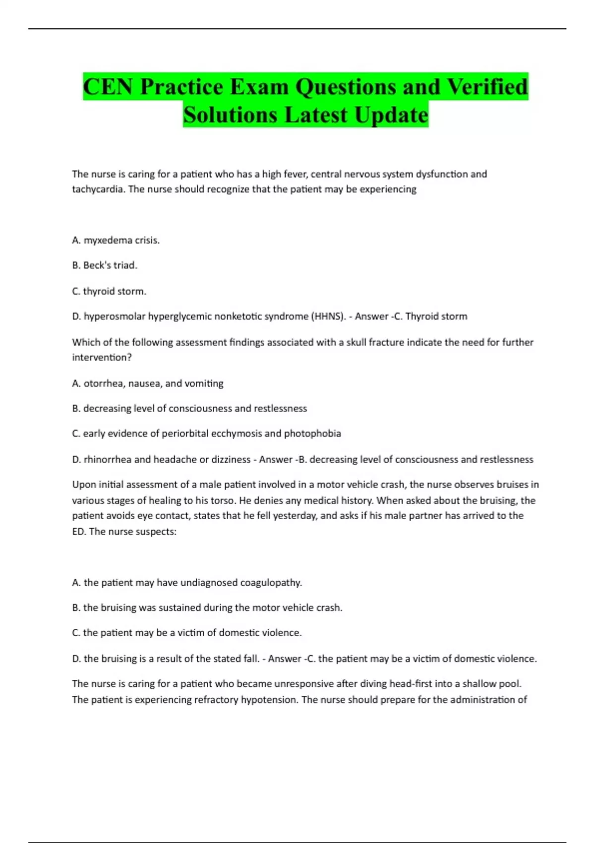 CEN Practice Exam Questions and Verified Solutions Latest Update The nurse is caring for a patient who has a high fever, central nervous system dysfunction and tachycardia. The nurse should recognize that the patient may be experiencing A. myxedema crisis. B. Beck's triad. C. thyroid storm. D. hyperosmolar hyperglycemic nonketotic syndrome (HHNS). - Answer -C. Thyroid storm Which of the following assessment findings associated with a skull fracture indicate the need for further intervention? A. otorrhea, nausea, and vomiting B. decreasing level of consciousness and restlessness C. early evidence of periorbital ecchymosis and photophobia D. rhinorrhea and headache or dizziness - Answer -B. decreasing level of consciousness and restlessness Upon initial assessment of a male patient involved in a motor vehicle crash, the nurse observes bruises in various stages of healing to his torso. He denies any medical history. When asked about the bruising, the patient avoids eye contact, states that he fell yesterday, and asks if his male partner has arrived to the ED. The nurse suspects: A. the patient may have undiagnosed coagulopathy. B. the bruising was sustained during the motor vehicle crash. C. the patient may be a victim of domestic violence. D. the bruising is a result of the stated fall. - Answer -C. the patient may be a victim of domestic violence. The nurse is caring for a patient who became unresponsive after diving head-first into a shallow pool. The patient is experiencing refractory hypotension. The nurse should prepare for the administration ofa. lactated Ringers. b. norepinephrine. c. normal saline. d. epinephrine. - Answer -b. norepinephrine A 3-year-old child who has acute respiratory distress is admitted to the emergency department. The child is sitting forward and drooling, and the neck is extended. These findings support the diagnosis of A. epiglottitis. B. bronchiolitis. C