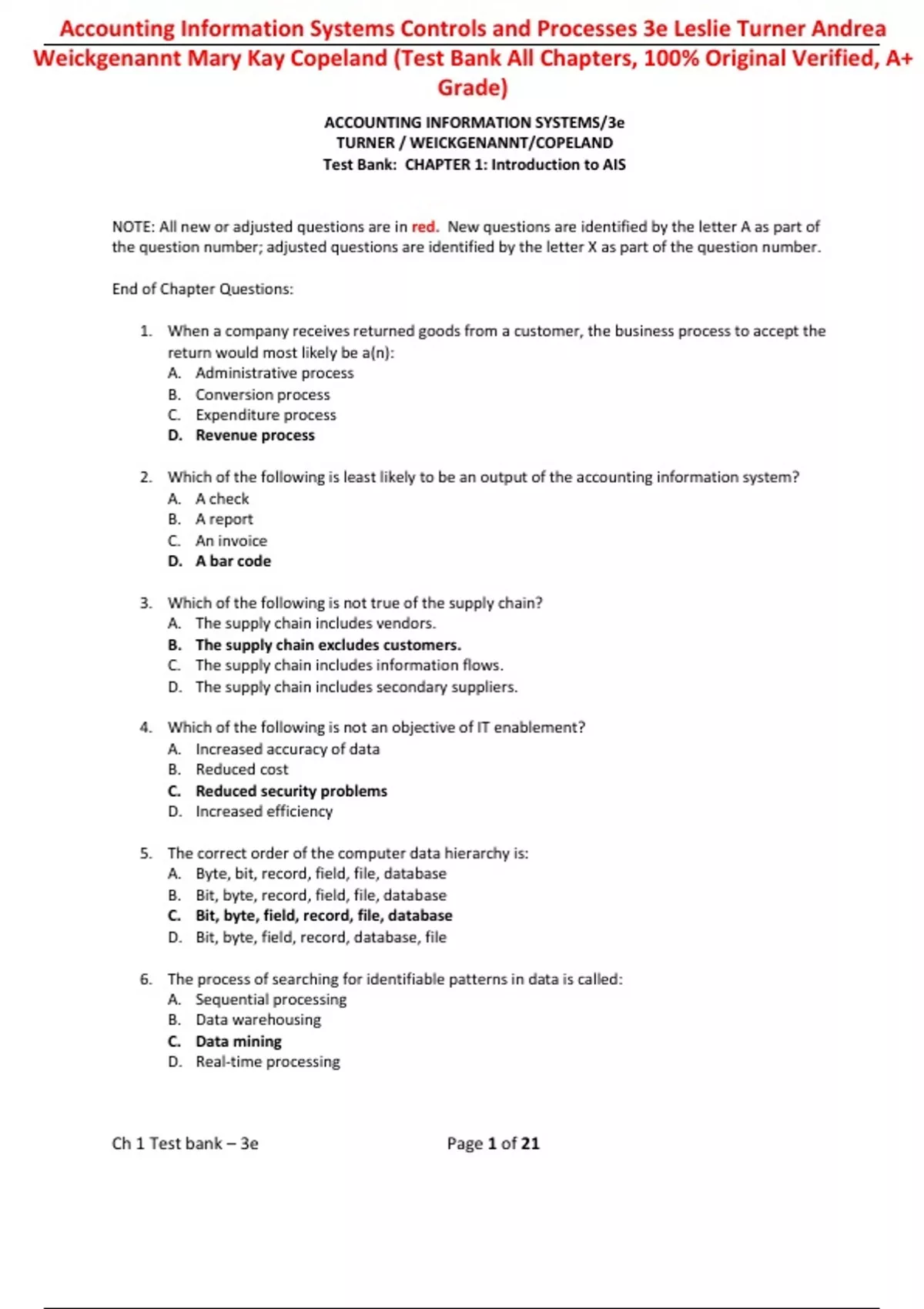 This Is Original 3rd Edition of Test Bank From Original Author. All Other Files in the market are fake/old Edition. Other Sellers Have changed old Edition Number to new But Test Bank is old Edition. Test Bank for Accounting Information Systems Controls and Processes 3rd Edition By Leslie Turner, Andrea Weickgenannt, Mary Kay Copeland (All Chapters, 100% Original Verified, A+ Grade) Test Bank for Accounting Information Systems Controls and Processes 3e By Leslie Turner, Andrea Weickgenannt, Mary Kay Copeland (All Chapters, 100% Original Verified, A+ Grade)