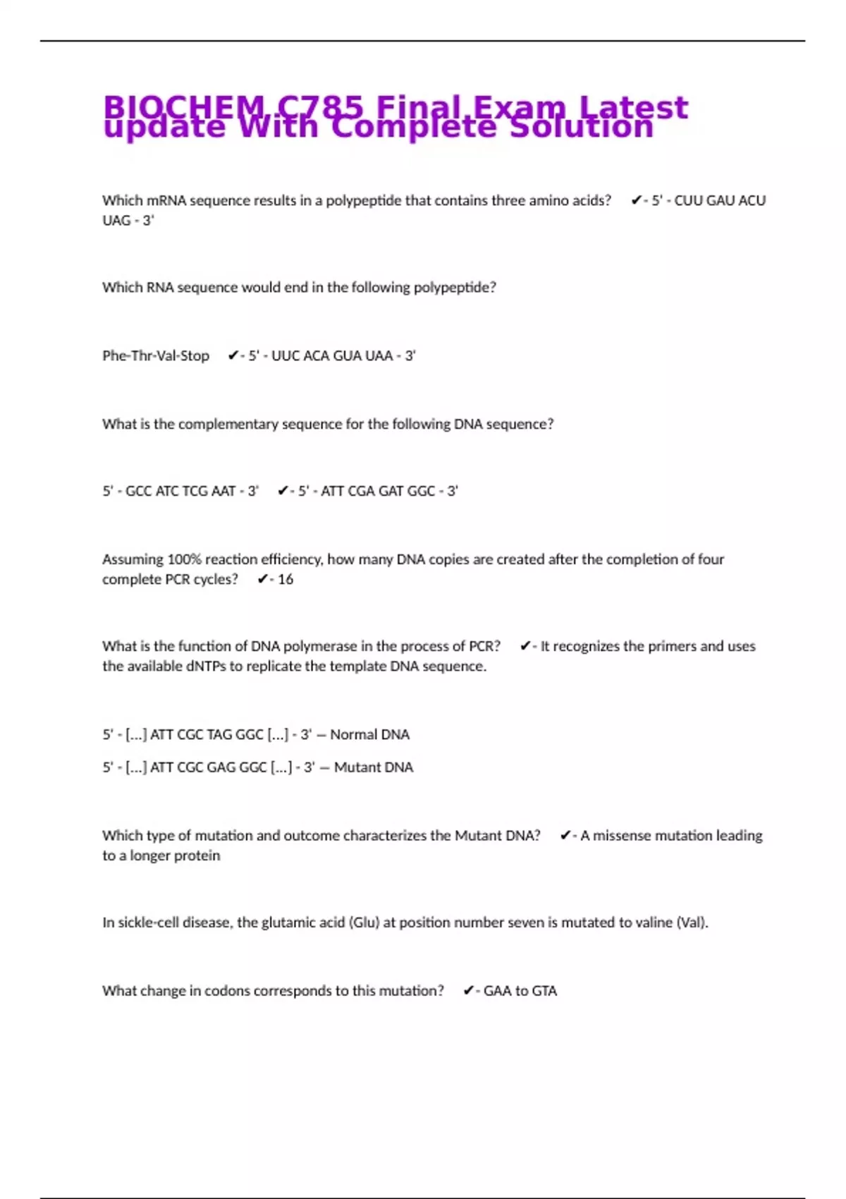 Which mRNA sequence results in a polypeptide that contains three amino acids? - 5' - CUU GAU ACU UAG - 3' Which RNA sequence would end in the following polypeptide? Phe-Thr-Val-Stop - 5' - UUC ACA GUA UAA - 3' What is the complementary sequence for the following DNA sequence? 5' - GCC ATC TCG AAT - 3' - 5' - ATT CGA GAT GGC - 3' Assuming 100% reaction efficiency, how many DNA copies are created after the completion of four complete PCR cycles? - 16 What is the function of DNA polymerase in the process of PCR? - It recognizes the primers and uses the available dNTPs to replicate the template DNA sequence. 5' - [...] ATT CGC TAG GGC [...] - 3' − Normal DNA 5' - [...] ATT CGC GAG GGC [...] - 3' − Mutant DNA Which type of mutation and outcome characterizes the Mutant DNA? - A missense mutation leading to a longer protein In sickle-cell disease, the glutamic acid (Glu) at position number seven is mutated to valine (Val). What change in codons corresponds to this mutation? - GAA to GTA What are possible blood types of the parents of a patient with blood type AB? - A and B Which