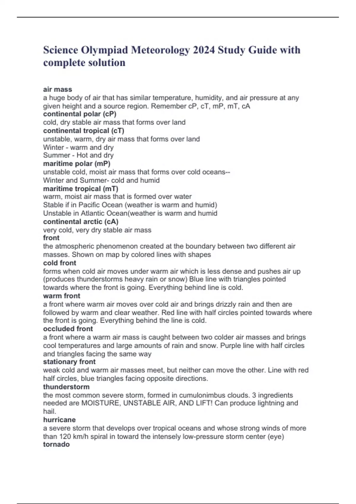 Science Olympiad Meteorology 2024 Study Guide with complete solution air mass a huge body of air that has similar temperature, humidity, and air pressure at any given height and a source region. Remember cP, cT, mP, mT, cA continental polar (cP) cold, dry stable air mass that forms over land continental tropical (cT) unstable, warm, dry air mass that forms over land Winter - warm and dry Summer - Hot and dry maritime polar (mP) unstable cold, moist air mass that forms over cold oceans-- Winter and Summer- cold and humid maritime tropical (mT) warm, moist air mass that is formed over water Stable if in Pacific Ocean (weather is warm and humid) Unstable in Atlantic Ocean(weather is warm and humid continental arctic (cA) very cold, very dry stable air mass front the atmospheric phenomenon created at the boundary between two different air masses. Shown on map by colored lines with shapes cold front forms when cold air moves under warm air which is less dense and pushes air up (produces thunderstorms heavy rain or snow) Blue line with triangles pointed towards where the front is going. Everything behind line is cold. warm front a front where warm air moves over cold air and brings drizzly rain and then are followed by warm and clear weather. Red line with half circles pointed towards where the front is going. Everything behind the line is cold. occluded front a front where a warm air mass is caught between two colder air masses and brings cool temperatures and large amounts of rain and snow. Purple line with half circles and triangles facing the same way stationary front weak cold and warm air masses meet, but neither can move the other. Line with red half circles, blue triangles facing opposite directions. thunderstorm the most common severe storm, formed in cumulonimbus clouds. 3 ingredients needed are MOISTURE, UNSTABLE AIR, AND LIFT! Can produce lightning and hail. hurricane a severe storm that develops over tropical oceans and whose strong winds of more than 120 km/h spiral in toward the intensely low-pressure storm center (eye) tornado
