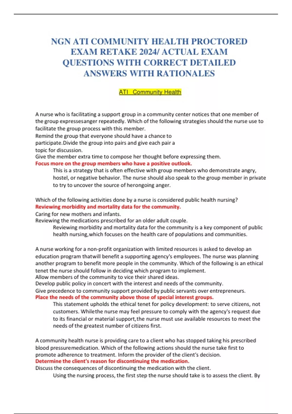 NGN ATI COMMUNITY HEALTH PROCTORED EXAM RETAKE 2024/ ACTUAL EXAM QUESTIONS WITH CORRECT DETAILED ANSWERS WITH RATIONALES