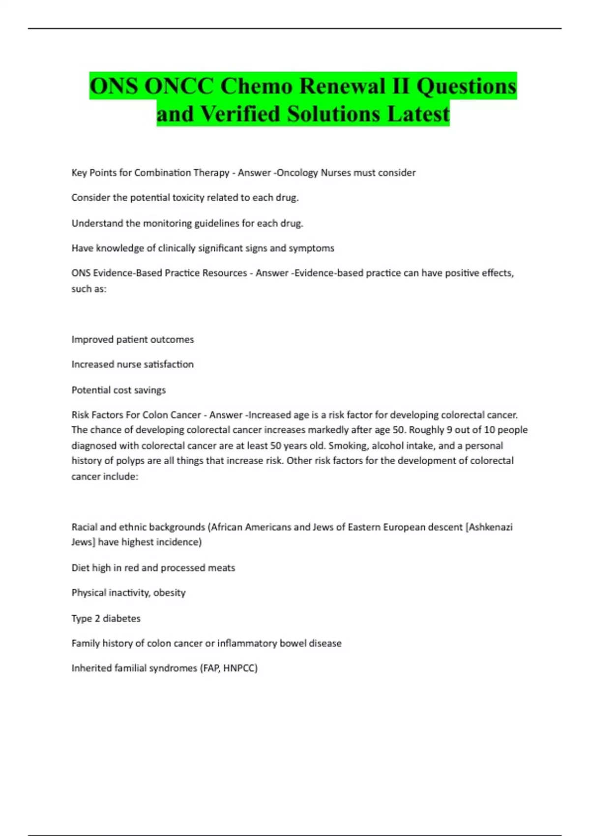 ONS ONCC Chemo Renewal II Questions and Verified Solutions Latest Key Points for Combination Therapy - Answer -Oncology Nurses must consider Consider the potential toxicity related to each drug. Understand the monitoring guidelines for each drug. Have knowledge of clinically significant signs and symptoms ONS Evidence-Based Practice Resources - Answer -Evidence-based practice can have positive effects, such as: Improved patient outcomes Increased nurse satisfaction Potential cost savings Risk Factors For Colon Cancer - Answer -Increased age is a risk factor for developing colorectal cancer. The chance of developing colorectal cancer increases markedly after age 50. Roughly 9 out of 10 people diagnosed with colorectal cancer are at least 50 years old. Smoking, alcohol intake, and a personal history of polyps are all things that increase risk. Other risk factors for the development of colorectal cancer include: Racial and ethnic backgrounds (African Americans and Jews of Eastern European descent [Ashkenazi Jews] have highest incidence) Diet high in red and processed meats Physical inactivity, obesity Type 2 diabetes Family history of colon cancer or inflammatory bowel disease Inherited familial syndromes (FAP, HNPCC)Patient Education on Chemotherapy - Answer -Patients are provided with verbal and written or electronic information as part of an education process before the first administration of treatment of each treatment plan. The content of this educational material will be documented. Educational information includes the following at a minimum: Patient's diagnosis Goals of treatment; that is, cure disease, prolong life, or reduce symptoms Planned duration of treatment, schedule of treatment administration, drug names and supportive medications, drug-drug and drug-food interactions, and plan for missed doses Potential long-term and short-term adverse effects of therapy, including infertility risks for appropriate patients
