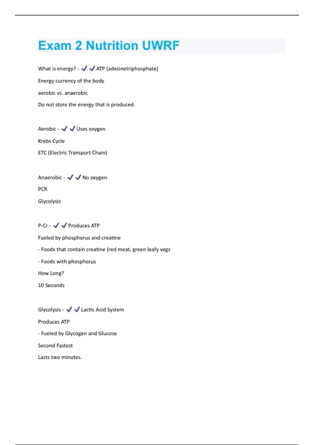 What is energy? - ATP (adesinetriphosphate) Energy currency of the body aerobic vs. anaerobic Do not store the energy that is produced. Aerobic - Uses oxygen Krebs Cycle ETC (Electric Transport Chain) Anaerobic - No oxygen PCR Glycolysis P-Cr - Produces ATP Fueled by phosphorus and creatine - Foods that contain creatine (red meat, green leafy vegs - Foods with phosphorus How Long? 10 Seconds Glycolysis - Lactic Acid System Produces ATP - Fueled by Glycogen and Glucose Second Fastest Lasts two minutes.Krebs ETC - Fueled by Glucose/macro-nutrients and oxygen Fat and protein goes through gluconeogenesis Produces ATP Slowest way to generated energy. Intensity - Anerobic - High Aerobic - Low Fat Burning Zone - 55%-70% of max heart rate 220 - age = (<70) 208 * .7 *(age) = What form of Carbohydrates must the body use? - Glucose and glycogen Where do they come from? Food Blood Stream Liver Muscle As exercise intensity increases Release of glucose from liver. As glucose/glycogen depleted, Where do we get energy from? - Aerobic - (Kreb cycle + ETC) = Slowest Anerobic (lactic acid system) = 2nd fastest If we rely on fat, we have to rely on the cycles, not as quick Bonking - During exercise. 99% of glucogen/ energy stores are depleted, Not replenishing carbohydrates.Power - Work / Time Strenuous Exercise - 70-95% VO2 max (Volume oxygen uptake) - Muscle glycogen - Liver glycogen - Depletion - 1 hour workout, 1/2 reserves (start to experience decrease in power) - 2 hours, exhausted Anaerobic Workout? -Especially true! - Liver glycogen and muscle glycogen in working muscle