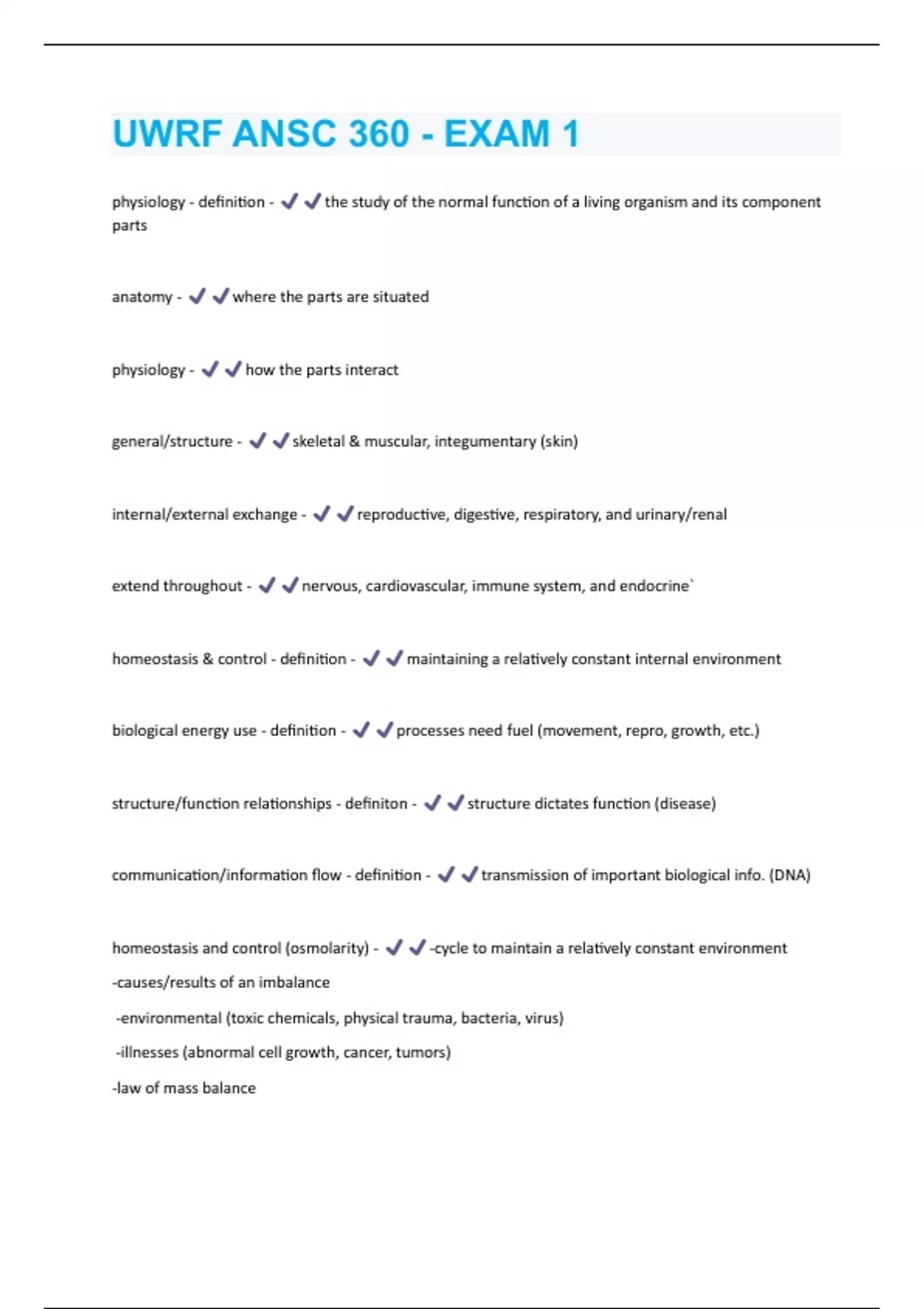 physiology - definition - the study of the normal function of a living organism and its component parts anatomy - where the parts are situated physiology - how the parts interact general/structure - skeletal & muscular, integumentary (skin) internal/external exchange - reproductive, digestive, respiratory, and urinary/renal extend throughout - nervous, cardiovascular, immune system, and endocrine` homeostasis & control - definition - maintaining a relatively constant internal environment biological energy use - definition - processes need fuel (movement, repro, growth, etc.) structure/function relationships - definiton - structure dictates function (disease) communication/information flow - definition - transmission of important biological info. (DNA) homeostasis and control (osmolarity) - -cycle to maintain a relatively constant environment -causes/results of an imbalance -environmental (toxic chemicals, physical trauma, bacteria, virus) -illnesses (abnormal cell growth, cancer, tumors) -law of mass balance-inputs (lung, GI, skin, metabolic production) -outputs (lungs, GI tract, kidneys, skin, metabolic production, liver) law of mass balance - if the amount of a substance in the body is to remain constant, any gain must be offset by equal loss *mass balance = body load + input - output* biological energy use (synthesis) - -synthesis, breakdown, transport (plant = photosynthesis, animals = biomolecules aka FOOD) structure dictates function (enzymes) - -molecular interactions (enzymes, signal molecules, receptor proteins) -compartmentation -organelles -body cavities (cranial, thoracic (pleural sac and pericardial sac), abdominopelvic (peritoneum)) -hallow organs (bladder, GI tract, uterus, lungs, heart, etc.) -fluid cavities (intracellular, extracellular (intertitial and plasma))