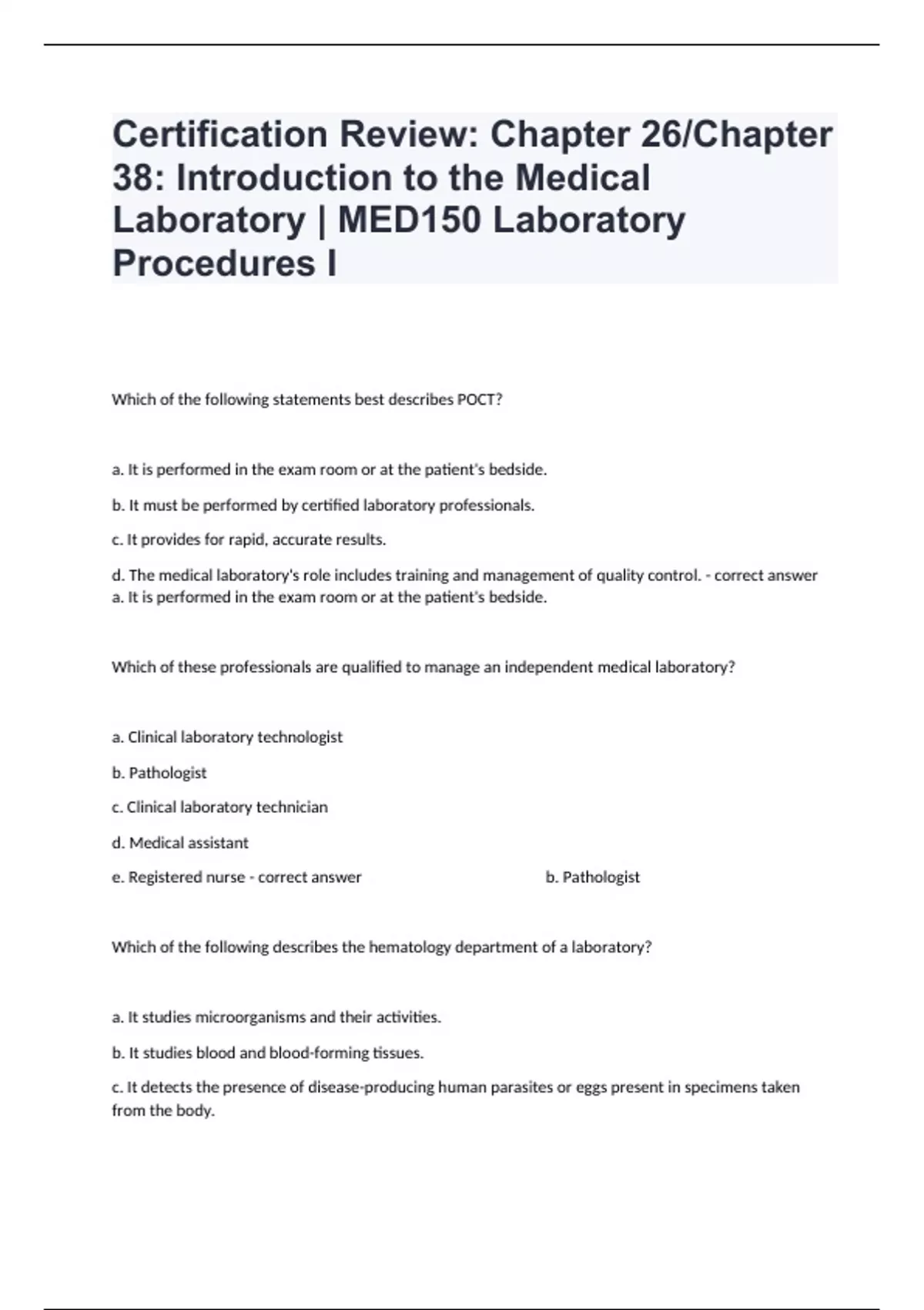 Certification Review: Chapter 26/Chapter 38: Introduction to the Medical Laboratory | MED150 Laboratory Procedures I Questions And Detailed Answers/2024.