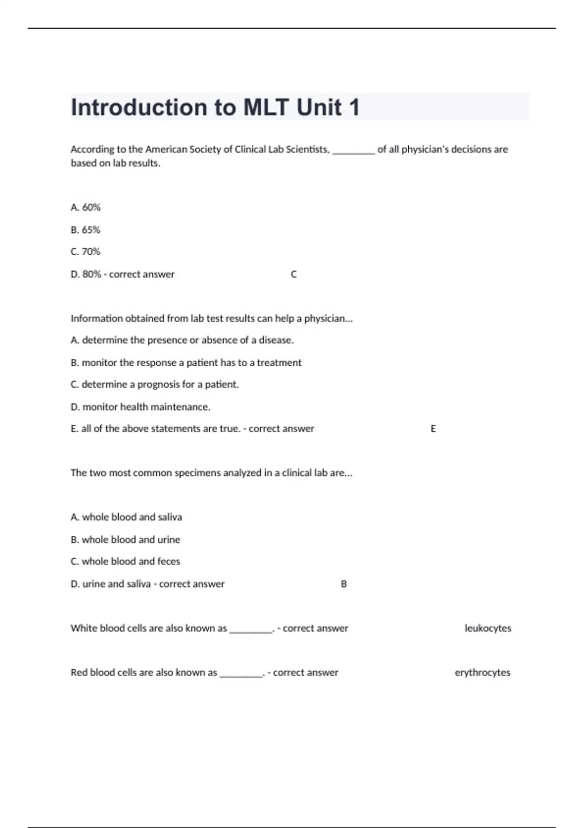 Introduction to MLT Unit 1 Exam Questions And Explanations Of Answers/2024.