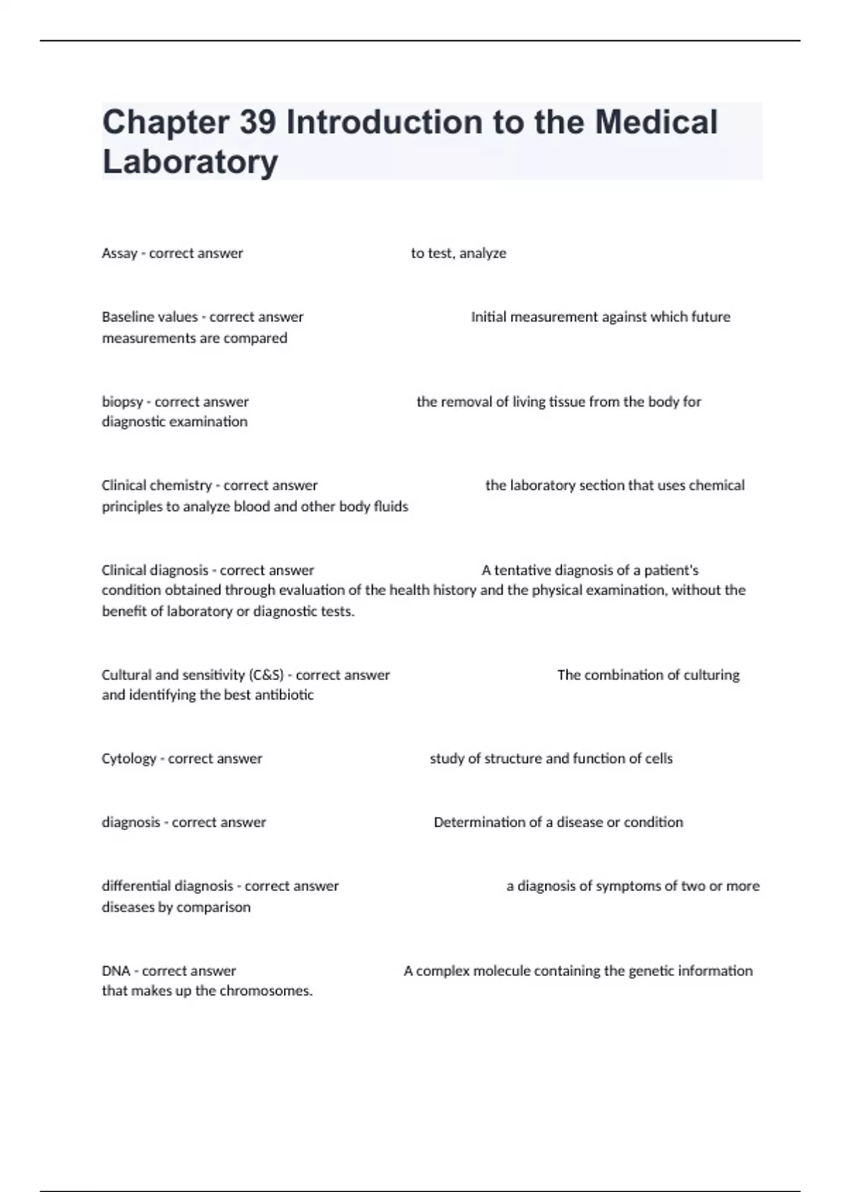 Assay - correct answer to test, analyze Baseline values - correct answer Initial measurement against which future measurements are compared biopsy - correct answer the removal of living tissue from the body for diagnostic examination Clinical chemistry - correct answer the laboratory section that uses chemical principles to analyze blood and other body fluids Clinical diagnosis - correct answer A tentative diagnosis of a patient's condition obtained through evaluation of the health history and the physical examination, without the benefit of laboratory or diagnostic tests. Cultural and sensitivity (C&S) - correct answer The combination of culturing and identifying the best antibiotic Cytology - correct answer study of structure and function of cells diagnosis - correct answer Determination of a disease or condition differential diagnosis - correct answer a diagnosis of symptoms of two or more diseases by comparison DNA - correct answer A complex molecule containing the genetic information that makes up the chromosomes. Electrolyte - correct answer Substances that conduct electricity whose components are important in maintaining fluid and acid base balance Glucose - correct answer Simple sugar that is a major source of energy in the human body ; monitoring of blood glucose Level in urine and blood is a vital diagnostic test in diabetes and other disorders; also a test on the reagent strip. Hematology - correct answer study of blood and blood forming tissues Histology - correct answer the study of the microscopic structure of tissues Hospital-based laboratories - correct answer hospital-owned laboratories that perform most tests required by the hospital and local communities Immunology - correct answer The study of components of the immune system in their function Immunohematology - correct answer study of blood group antigens and antibodies; blood banking Invasive - correct answer Surgical technique or procedure that requires penetration of the skin or a body opening.The potential for pathogenic microorganisms to enter the bodies exits. Microbiology - correct answer A branch of biology dealing especially with microscopic forms of life (as bacteria, protozoans, viruses, and fungi). Panel - correct answer Series of tests related to particular Organ or organ system of body function. Parasitology - correct answer Study of organisms( parasites and their eggs) that live within or on another organism and at the expense of that organism Patient service centers - correct answer Satellite laboratory facilities located in convenient areas for patients where specimens can be collected or dropped off Peak - correct answer The opposite off "trough" this is The point at which a drug is at its highest level in the body, usually about 30 minutes after administration. In lab tests, the peak would tell the provider the strongest influence of the drug would have on the body at the particular does. Physician's office laboratory - correct answer (POL) Physicians in office laboratory Qualitative tests - correct answer analysis to identify quality or characteristics of components, such as size, shape, and maturity of cells Quantitative tests - correct answer analysis that can identify quantity or actual number counts such as counting the number of blood cells Reagent - correct answer chemical used in an experiment Reference Labratories - correct answer Large, independent laboratories that test specimens from many different facilities Reference values - correct answer also referred to as normal value, normal range, or reference range; range of values that includes 95% of test results for a normal healthy population Requsition - correct answer to demand or request such made with proper authority Serum - correct answer liquid portion of the blood that remains after clotting therapeutic drug monitoring (TDM) - correct answer Periodic blood tests to determine the effectiveness of a particular drug. Drugs will have a therapeutic level that