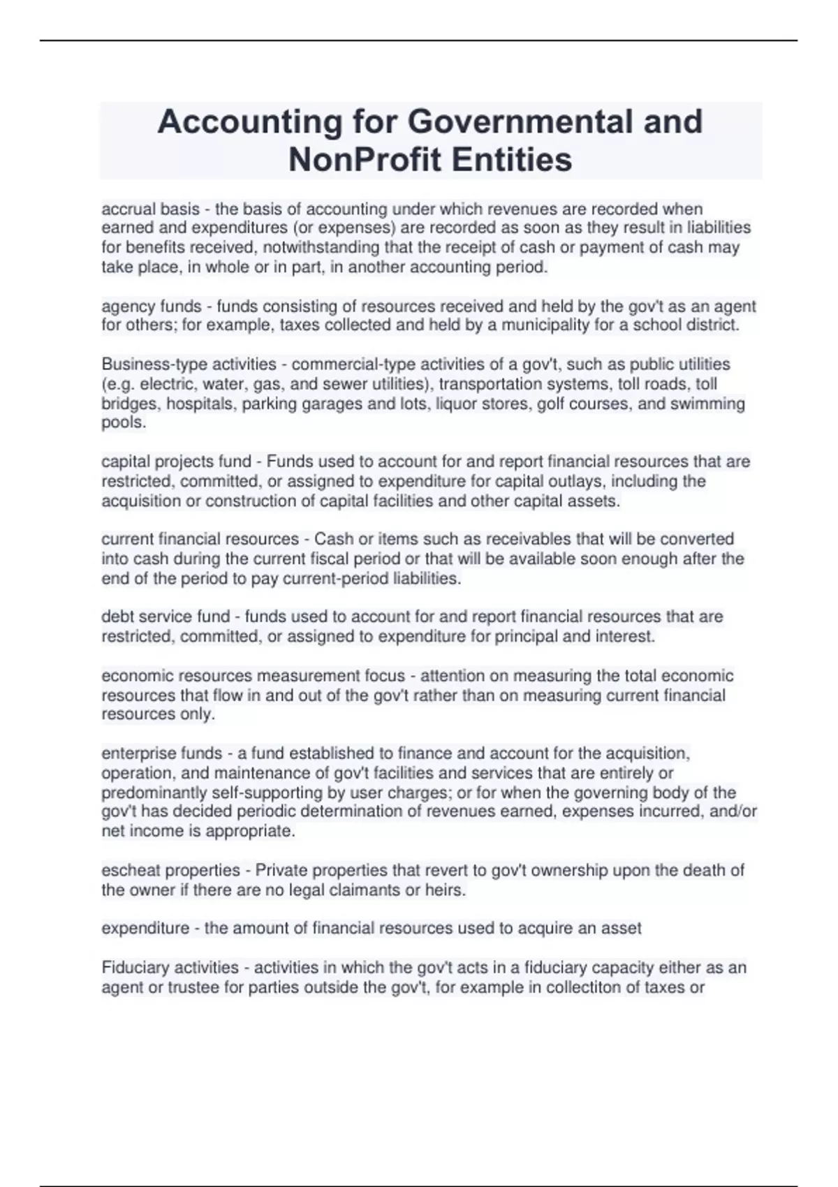 accrual basis - the basis of accounting under which revenues are recorded when earned and expenditures (or expenses) are recorded as soon as they result in liabilities for benefits received, notwithstanding that the receipt of cash or payment of cash may take place, in whole or in part, in another accounting period. agency funds - funds consisting of resources received and held by the gov't as an agent for others; for example, taxes collected and held by a municipality for a school district. Business-type activities - commercial-type activities of a gov't, such as public utilities (e.g. electric, water, gas, and sewer utilities), transportation systems, toll roads, toll bridges, hospitals, parking garages and lots, liquor stores, golf courses, and swimming pools. capital projects fund - Funds used to account for and report financial resources that are restricted, committed, or assigned to expenditure for capital outlays, including the acquisition or construction of capital facilities and other capital assets. current financial resources - Cash or items such as receivables that will be converted into cash during the current fiscal period or that will be available soon enough after the end of the period to pay current-period liabilities. debt service fund - funds used to account for and report financial resources that are restricted, committed, or assigned to expenditure for principal and interest. economic resources measurement focus - attention on measuring the total economic resources that flow in and out of the gov't rather than on measuring current financial resources only. enterprise funds - a fund established to finance and account for the acquisition, operation, and maintenance of gov't facilities and services that are entirely or predominantly self-supporting by user charges; or for when the governing body of the gov't has decided periodic determination of revenues earned, expenses incurred, and/or net income is appropriate.