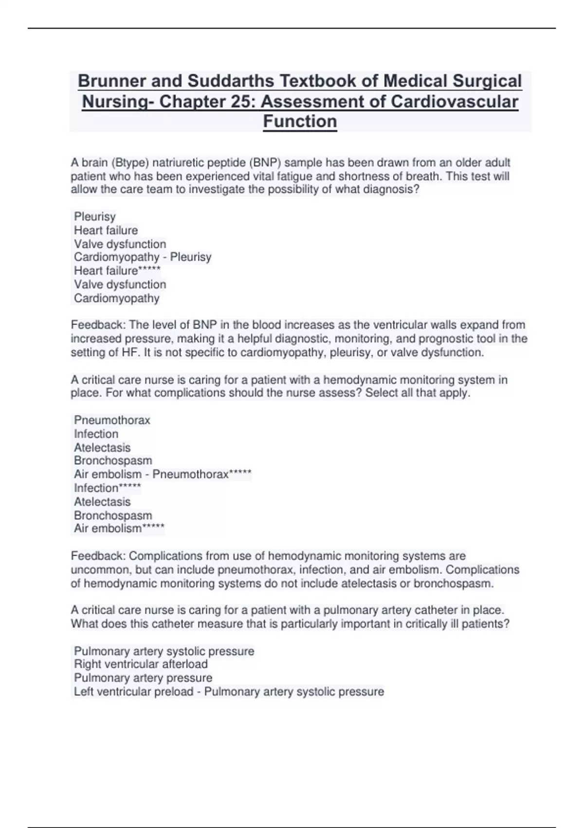 A brain (Btype) natriuretic peptide (BNP) sample has been drawn from an older adult patient who has been experienced vital fatigue and shortness of breath. This test will allow the care team to investigate the possibility of what diagnosis? Pleurisy Heart failure Valve dysfunction Cardiomyopathy - Pleurisy Heart failure***** Valve dysfunction Cardiomyopathy Feedback: The level of BNP in the blood increases as the ventricular walls expand from increased pressure, making it a helpful diagnostic, monitoring, and prognostic tool in the setting of HF. It is not specific to cardiomyopathy, pleurisy, or valve dysfunction. A critical care nurse is caring for a patient with a hemodynamic monitoring system in place. For what complications should the nurse assess? Select all that apply. Pneumothorax Infection Atelectasis Bronchospasm Air embolism - Pneumothorax***** Infection***** Atelectasis Bronchospasm Air embolism***** Feedback: Complications from use of hemodynamic monitoring systems are uncommon, but can include pneumothorax, infection, and air embolism. Complications of hemodynamic monitoring systems do not include atelectasis or bronchospasm