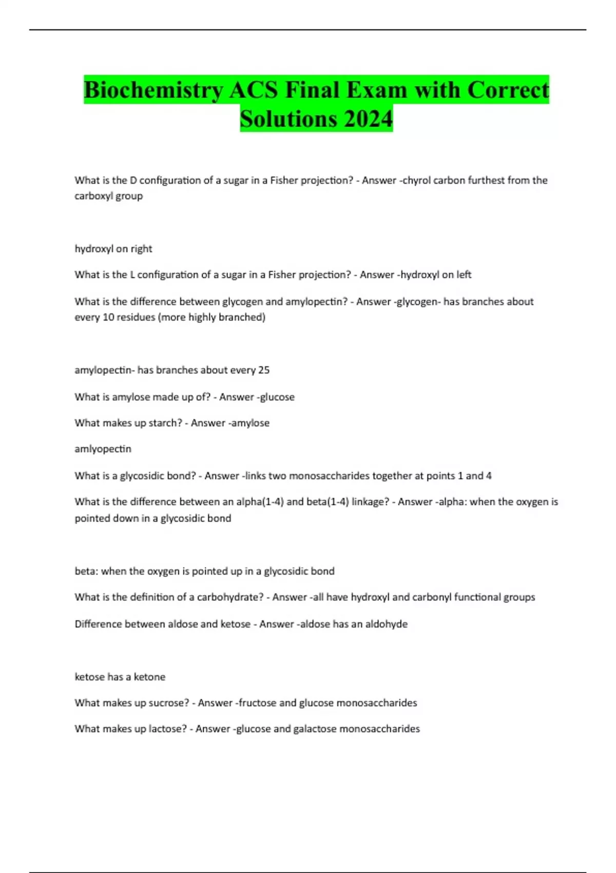 Biochemistry ACS Final Exam with Correct Solutions 2024 What is the D configuration of a sugar in a Fisher projection? - Answer -chyrol carbon furthest from the carboxyl group hydroxyl on right What is the L configuration of a sugar in a Fisher projection? - Answer -hydroxyl on left What is the difference between glycogen and amylopectin? - Answer -glycogen- has branches about every 10 residues (more highly branched) amylopectin- has branches about every 25 What is amylose made up of? - Answer -glucose What makes up starch? - Answer -amylose amlyopectin What is a glycosidic bond? - Answer -links two monosaccharides together at points 1 and 4 What is the difference between an alpha(1-4) and beta(1-4) linkage? - Answer -alpha: when the oxygen is pointed down in a glycosidic bond beta: when the oxygen is pointed up in a glycosidic bond What is the definition of a carbohydrate? - Answer -all have hydroxyl and carbonyl functional groups Difference between aldose and ketose - Answer -aldose has an aldohyde ketose has a ketone What makes up sucrose? - Answer -fructose and glucose monosaccharides What makes up lactose? - Answer -glucose and galactose monosaccha