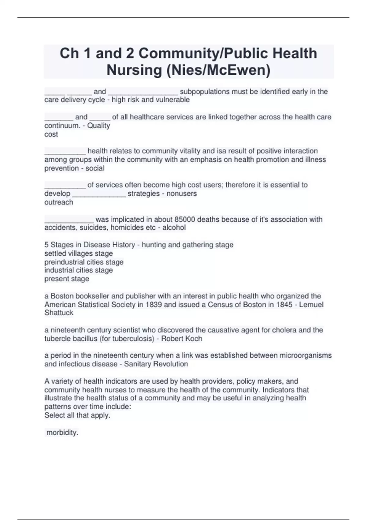 _____ ______ and _________________ subpopulations must be identified early in the care delivery cycle - high risk and vulnerable _______ and _____ of all healthcare services are linked together across the health care continuum. - Quality cost __________ health relates to community vitality and isa result of positive interaction among groups within the community with an emphasis on health promotion and illness prevention - social __________ of services often become high cost users; therefore it is essential to develop _____________ strategies - nonusers outreach ____________ was implicated in about 85000 deaths because of it's association with accidents, suicides, homicides etc - alcohol 5 Stages in Disease History - hunting and gathering stage settled villages stage preindustrial cities stage industrial cities stage present stage a Boston bookseller and publisher with an interest in public health who organized the American Statistical Society in 1839 and issued a Census of Boston in 1845 - Lemuel Shattuck a nineteenth century scientist who discovered the causative agent for cholera and the tubercle bacillus (for tuberculosis) - Robert Koch