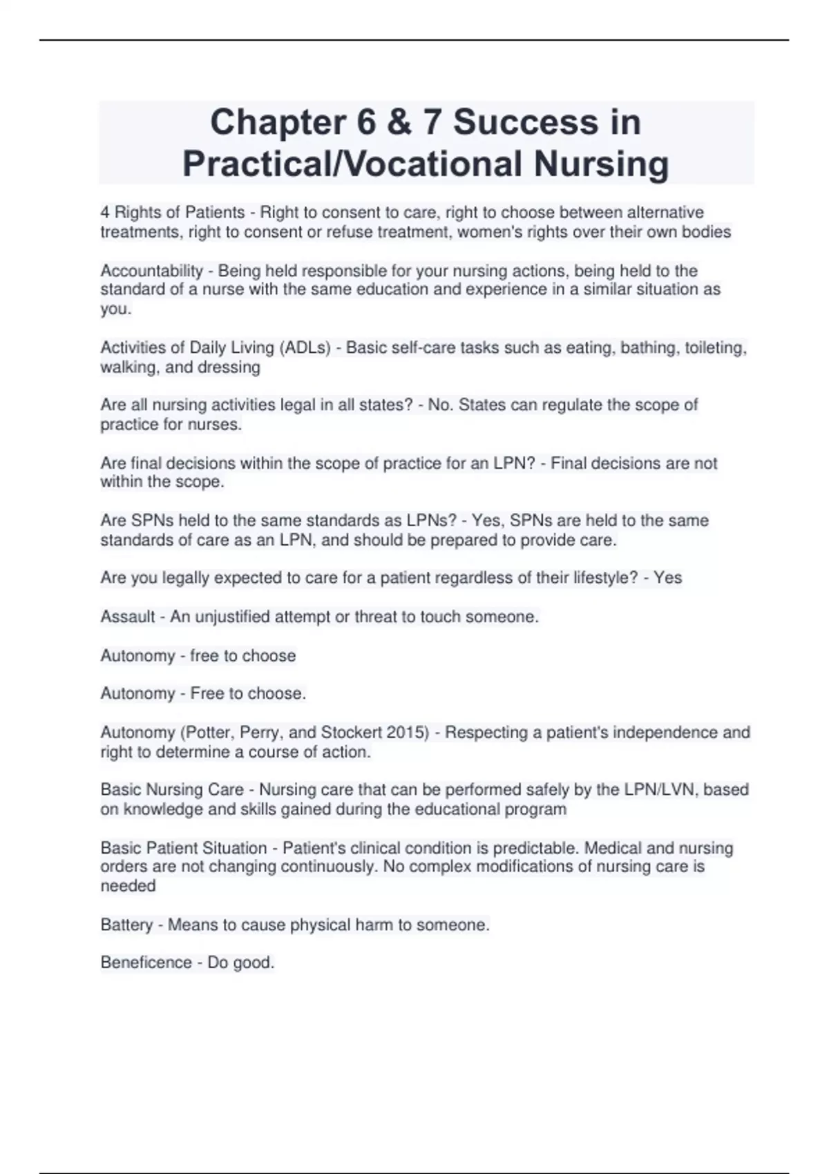 4 Rights of Patients - Right to consent to care, right to choose between alternative treatments, right to consent or refuse treatment, women's rights over their own bodies Accountability - Being held responsible for your nursing actions, being held to the standard of a nurse with the same education and experience in a similar situation as you. Activities of Daily Living (ADLs) - Basic self-care tasks such as eating, bathing, toileting, walking, and dressing Are all nursing activities legal in all states? - No. States can regulate the scope of practice for nurses. Are final decisions within the scope of practice for an LPN? - Final decisions are not within the scope. Are SPNs held to the same standards as LPNs? - Yes, SPNs are held to the same standards of care as an LPN, and should be prepared to provide care. Are you legally expected to care for a patient regardless of their lifestyle? - Yes Assault - An unjustified attempt or threat to touch someone. Autonomy - free to choose Autonomy - Free to choose. Autonomy (Potter, Perry, and Stockert 2015) - Respecting a patient's independence and right to determine a course of action. Basic Nursing Care - Nursing care that can be performed safely by the LPN/LVN, based on knowledge and skills gained during the educational program Basic Patient Situation - Patient's clinical condition is predictable. Medical and nursing orders are not changing continuously. No complex modifications of nursing care is needed Battery - Means to cause physical harm to someone. Beneficence - Do good