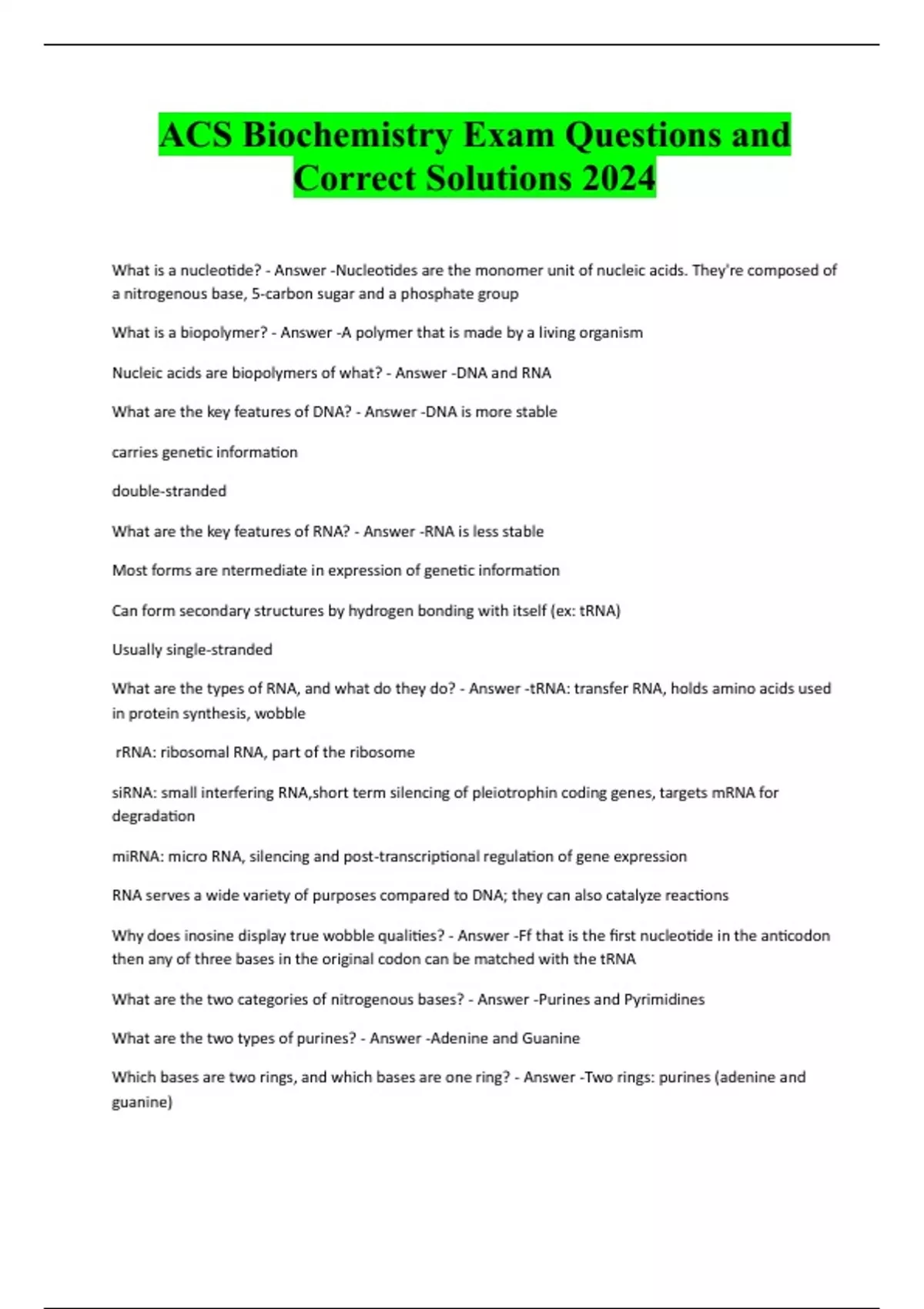 ACS Biochemistry Exam Questions and Correct Solutions 2024 What is a nucleotide? - Answer -Nucleotides are the monomer unit of nucleic acids. They're composed of a nitrogenous base, 5-carbon sugar and a phosphate group What is a biopolymer? - Answer -A polymer that is made by a living organism Nucleic acids are biopolymers of what? - Answer -DNA and RNA What are the key features of DNA? - Answer -DNA is more stable carries genetic information double-stranded What are the key features of RNA? - Answer -RNA is less stable Most forms are ntermediate in expression of genetic information Can form secondary structures by hydrogen bonding with itself (ex: tRNA) Usually single-stranded What are the types of RNA, and what do they do? - Answer -tRNA: transfer RNA, holds amino acids used in protein synthesis, wobble rRNA: ribosomal RNA, part of the ribosome siRNA: small interfering RNA,short term silencing of pleiotrophin coding genes, targets mRNA for degradation miRNA: micro RNA, silencing and post-transcriptional regulation of gene expression RNA serves a wide variety of purposes compared to DNA; they can also catalyze reactions Why does inosine display true wobble qualities? - Answer -Ff that is the first nucleotide in the anticodon then any of three bases in the original codon can be matched with the tRNA What are the two categories of nitrogenous bases? - Answer -Purine