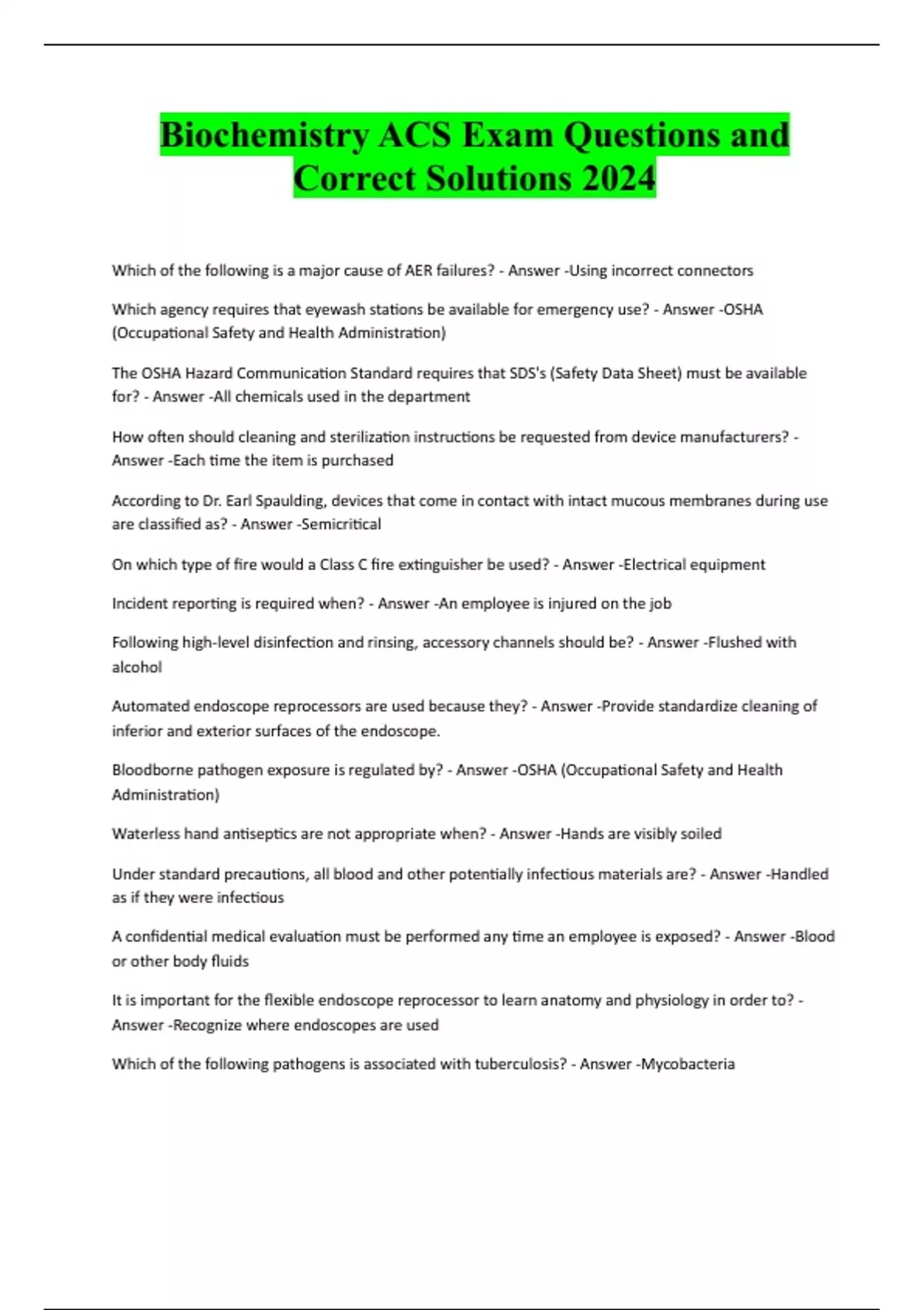 Biochemistry ACS Exam Questions and Correct Solutions 2024 Which of the following is a major cause of AER failures? - Answer -Using incorrect connectors Which agency requires that eyewash stations be available for emergency use? - Answer -OSHA (Occupational Safety and Health Administration) The OSHA Hazard Communication Standard requires that SDS's (Safety Data Sheet) must be available for? - Answer -All chemicals used in the department How often should cleaning and sterilization instructions be requested from device manufacturers? - Answer -Each time the item is purchased According to Dr. Earl Spaulding, devices that come in contact with intact mucous membranes during use are classified as? - Answer -Semicritical On which type of fire would a Class C fire extinguisher be used? - Answer -Electrical equipment Incident reporting is required when? - Answer -An employee is injured on the job Following high-level disinfection and rinsing, accessory channels should be? - Answer -Flushed with alcohol Automated endoscope reprocessors are used because they? - Answer -Provide standardize cleaning of inferior and exterior surfaces of the endoscope. Bloodborne pathogen exposure is regulated by? - Answer -OSHA (Occupational Safety and Health Administration) Waterless hand antiseptics are not appropriate when? - Answer -Hands are visibly soiled Under standard precautions, all blood and other potentially infectious mat
