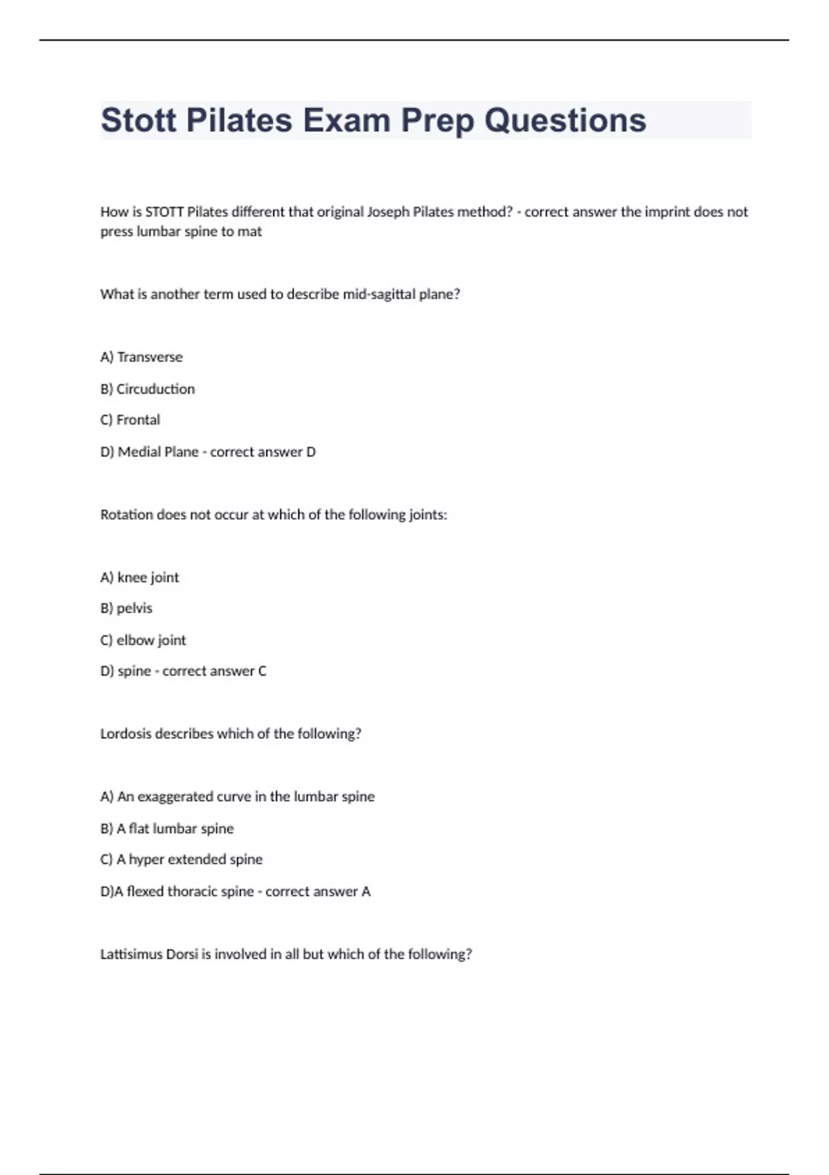 Stott Pilates Exam Prep Questions. and answers rated A+ 2024