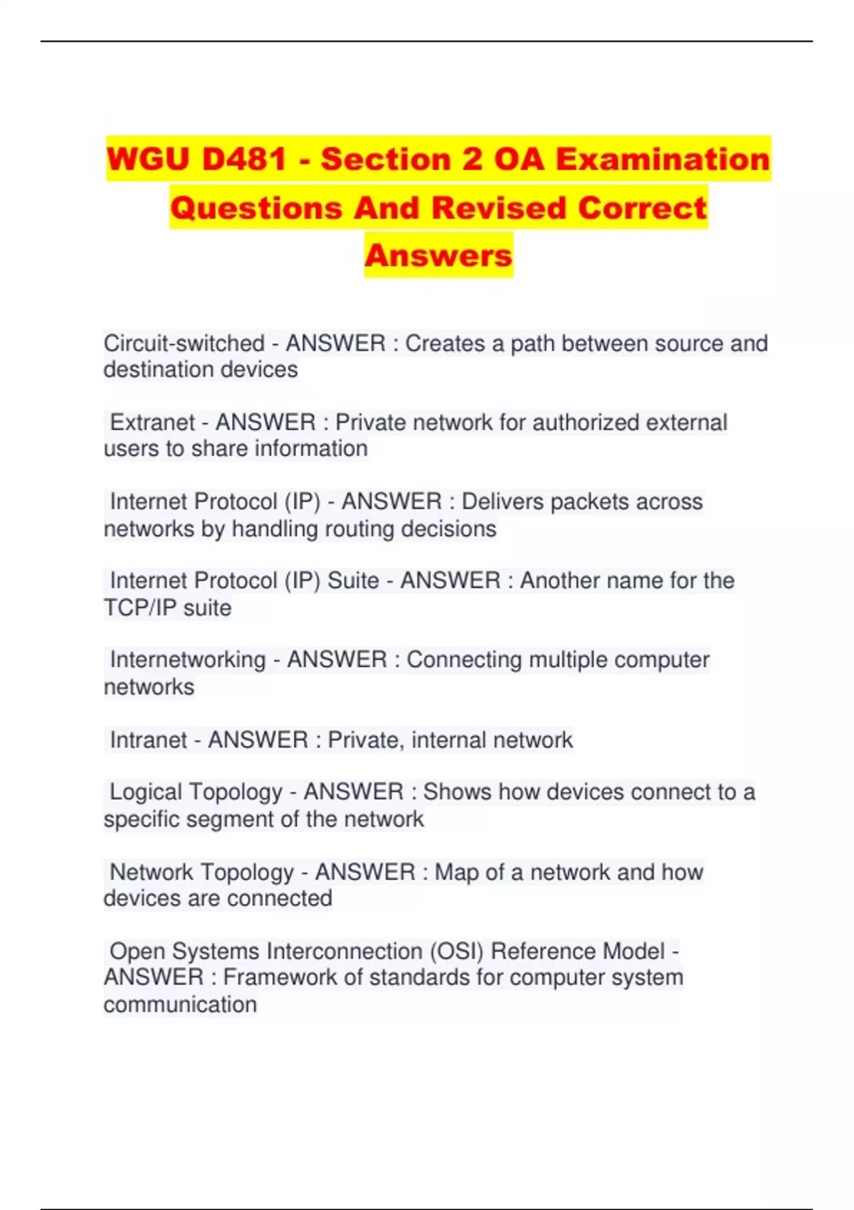WGU D481 - Section 2 OA Examination Questions And Revised Correct Answers Circuit-switched - ANSWER : Creates a path between source and destination devices Extranet - ANSWER : Private network for authorized external users to share information Internet Protocol (IP) - ANSWER : Delivers packets across networks by handling routing decisions Internet Protocol (IP) Suite - ANSWER : Another name for the TCP/IP suite Internetworking - ANSWER : Connecting multiple computer networks Intranet - ANSWER : Private, internal network Logical Topology - ANSWER : Shows how devices connect to a specific segment of the network Network Topology - ANSWER : Map of a network and how devices are connected Open Systems Interconnection (OSI) Reference Model - ANSWER : Framework of standards for computer system communication Packet-switched - ANSWER : Networks that transmit packets as individual messages Physical Topology - ANSWER : Physical network devices and devices used to connect Point-to-point Network - ANSWER : Network consisting only of directly connected computers and devices Transmission Control Protocol (TCP) - ANSWER : Guarantees reliable data stream between two computers Transmission Control Protocol/Internet Protocol (TCP/IP) Reference Model - ANSWER : Descriptive framework for computer network protocols Transmission Control Protocol/Internet Protocol (TCP/IP) Suite - ANSWER : Collection that provides support to internet-capable systems and devices