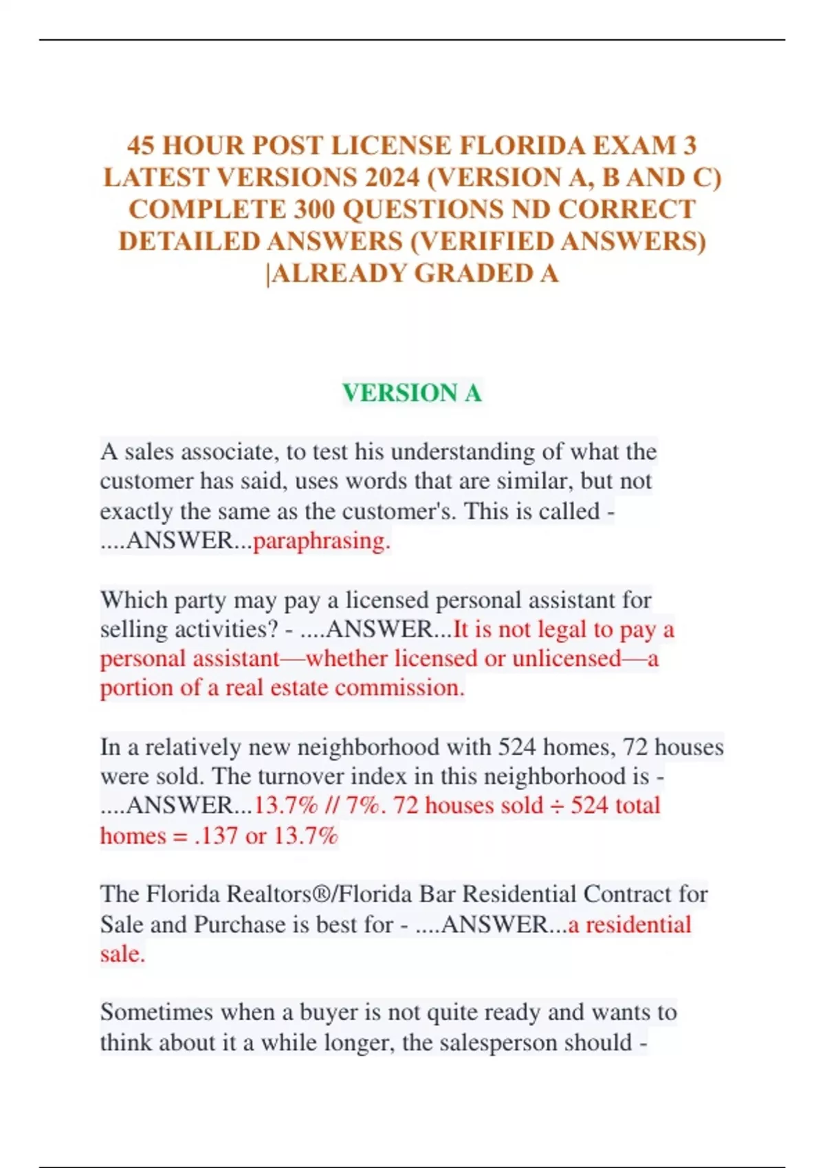 45 HOUR POST LICENSE FLORIDA EXAM 3 LATEST VERSIONS 2024 (VERSION A, B AND C) COMPLETE 300 QUESTIONS ND CORRECT DETAILED ANSWERS (VERIFIED ANSWERS) |ALREADY GRADED A